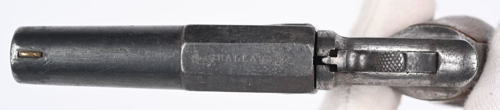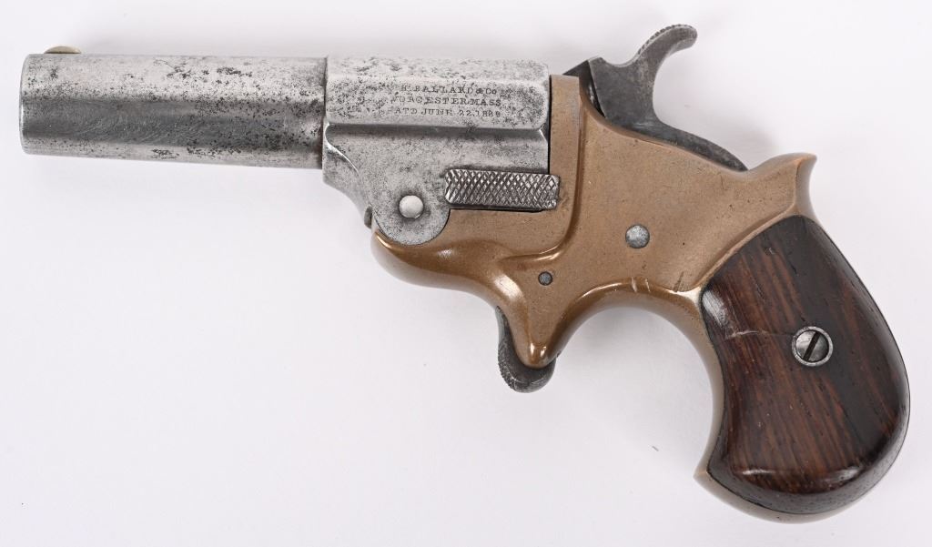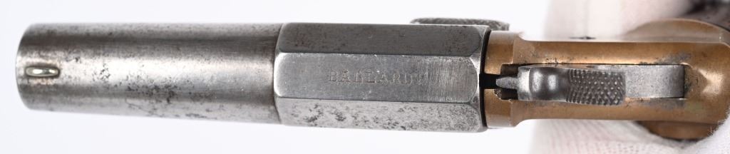 SERIAL NUMBER 1128 / 152 BARREL 2 3/16 CALIBER 41 RIM FIRE MANUFACTURED CIRCA 1870. One iron and one brass birds head gripped frame with part octagon barrel marked "BALLARD'S" on top flat and having 3 line C.H Ballard's address on left barrel flat. Small German silver blade front sight with spur trigger and sliding breech latch. CONDITIONS. Good with exterior finishes having toned to patina. Both have properly functioning actions. Both have matching numbers with iron frame example having period unmarked walnut grips. ANTIQUE
