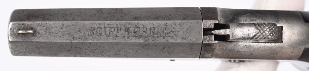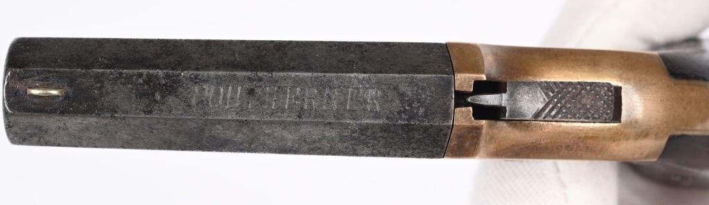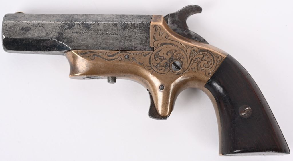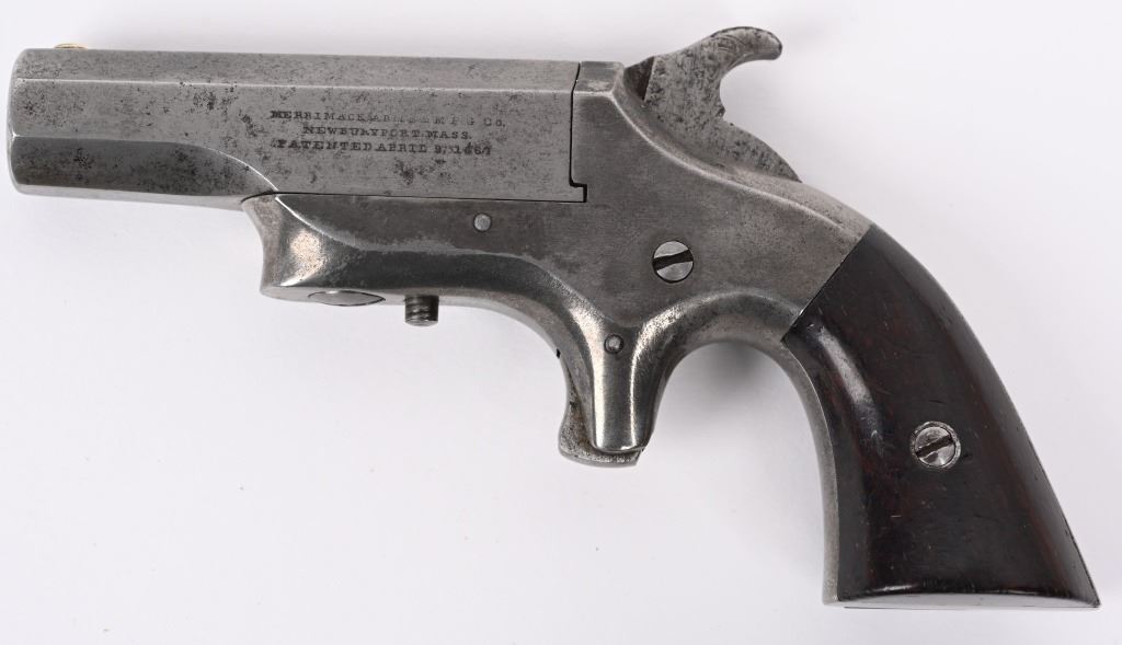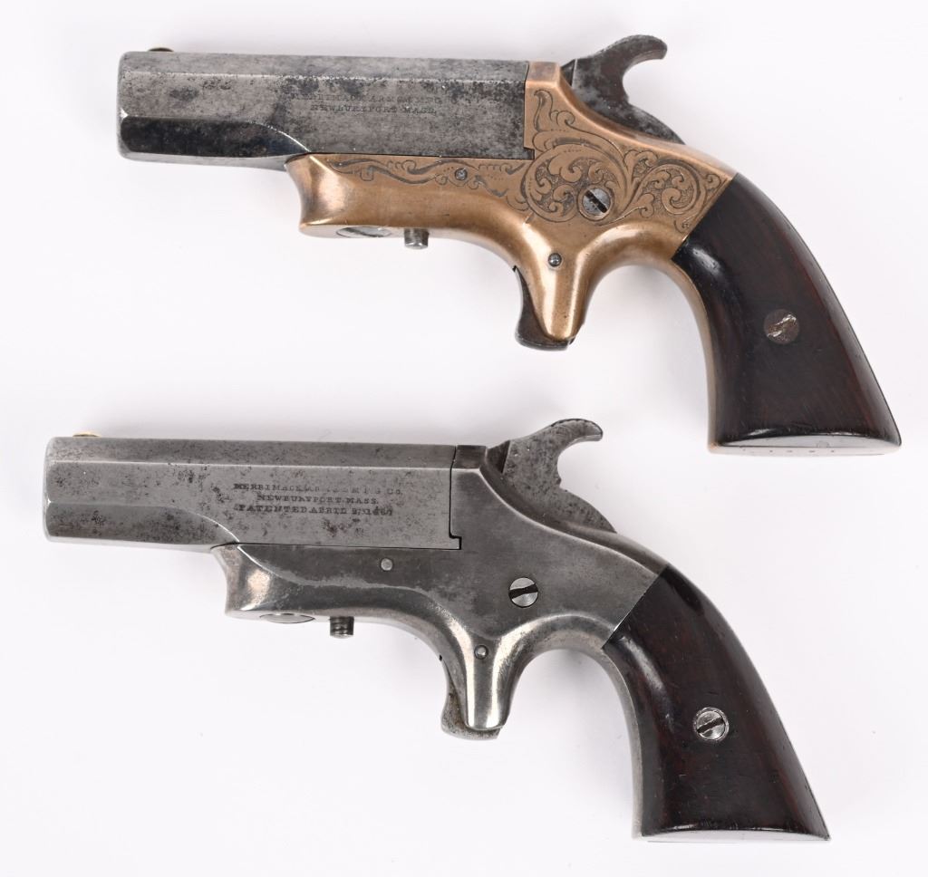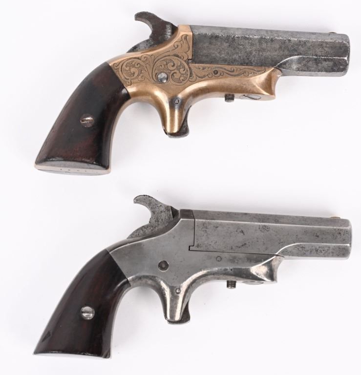 SERIAL NUMBER 2518 / 1991 BARREL 2 1/2" CALIBER 41 RIM FIRE MANUFACTURED 1866-1873. Produced by the Merrimack Arms Company Newburyport Mass. Octagon barrels marked "SOUTHERNER" on top flat with Merrimack Arms Company address on left barrel flat. #1991 is factory engraved , brass frame version with 2 piece varnished walnut grips. #2518 is scarce iron frame version with same markings. CONDITIONS. Good with both pistols operating properly. Both have very good bright bores. Grips are good with iron frame example having a couple small chips. ANTIQUE