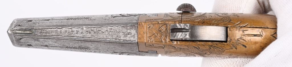 SERIAL NUMBER 3632 BARREL 2 1/2" CALIBER 41 RIM FIRE MANUFACTURED 1860-1865. Brass frame with spur trigger. Factory engraved frame with checkered backstrap. Desireable variant with large arrow engraved on barrel. Barrel marked on top flat " MOORE'S,PAT.F.A. CO. BROOKLYN N.Y." Silver plated frame with blue finished barrel Patent dates on underside of barrel..CONDITION. Good with only the slightest traces of original finish in the most protected of areas. Bore is good. Hammer fails to stay on safety position but operates from full cock. Markings are good. ANTIQUE