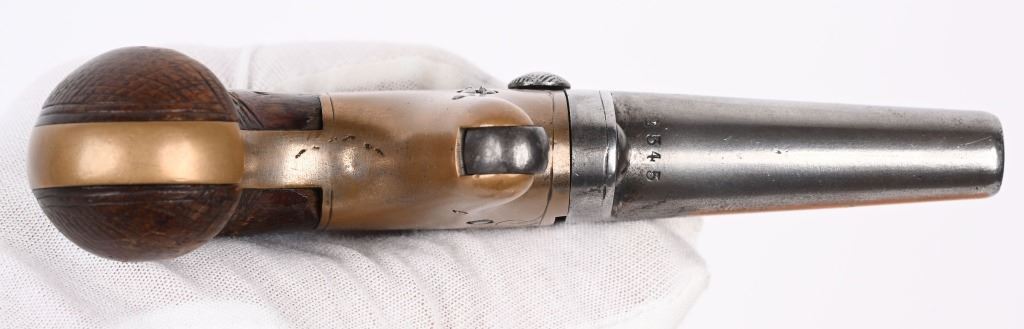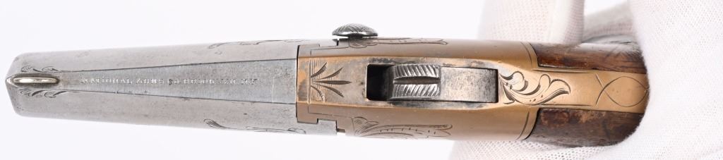 SERIAL NUMBER 2545 BARREL 2 1/2" CALIBER 41 RIM FIRE MANUFACTURED 1865-70. A limited production of 12000 produced before being sold to Colt. Brass frame with 2 piece checkered walnut grips. Modestly factory engraved on frame and barrel with top of barrel marked "NATIONAL ARMS CO. BROOKLYN N.Y." CONDITION, Very good with brass frame having a pleasnt uncleaned patina. Barrel is grey with fine bright bore. Action operates properly. ANTIQUE