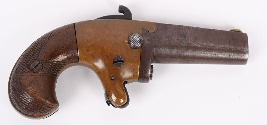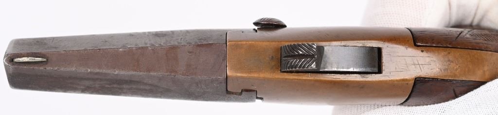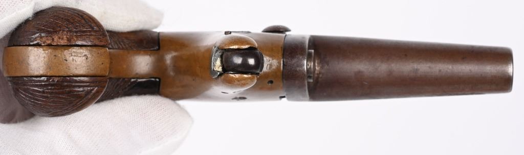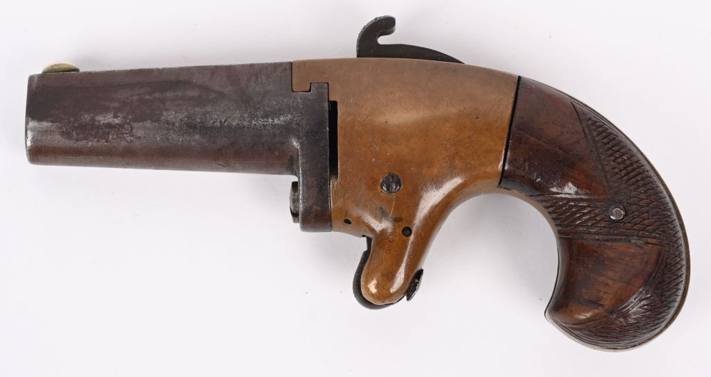SERIAL NUMBER N/A BARREL 2 1/2" CALIBER 41 RIMFIRE MANUFACTURED CIRCA 1865-70. This unique pistol was assembled by a probable employee by taking parts home and finishing or assembling off site. Unmarked barrel with small German silver front sight and brass unadorned or embellished frame with birds head grips and 2 piece walnut grips. Pistol is void of any markings or numbers. Most obviously a National No 2 pistol but with a small casting flaw behind the spur trigger. This flaw could explain the ability to acquire the frame and parts for at home non-factory assembly. A noted Derringer expert & Dealer believes this to be an experimental safety feature that is unknown and is also unknown as to how it operates. CONDITION, Very good with a wonderful uncleaned deep patina finish of the brass frame. The barrel appears to have been period browned. The bore is dark with visible rifling the action operates properly. The casting flaw to the rear of the trigger is loosely soldered. The two piece grips are period affixed with a wood screw. ANTQIUE