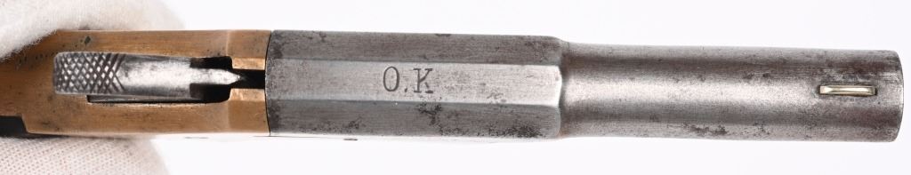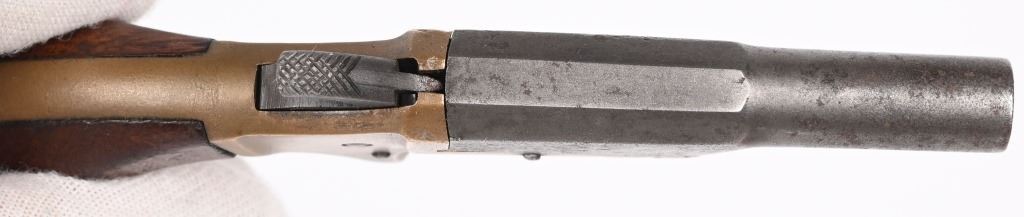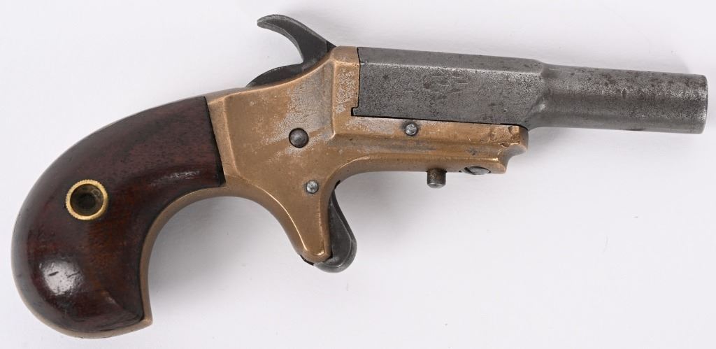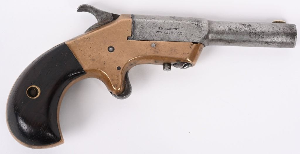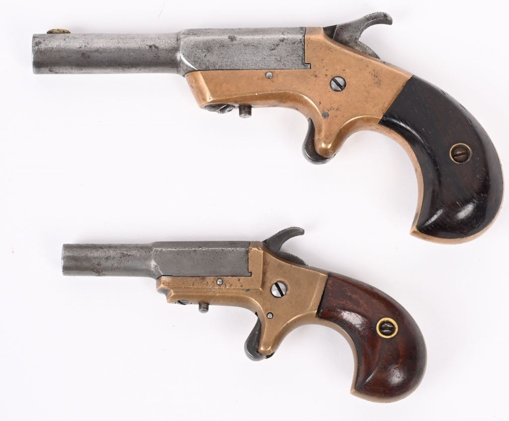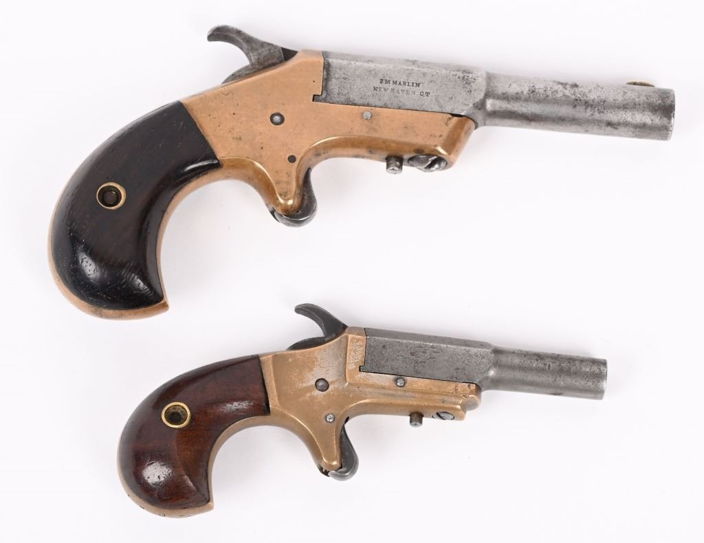 SERIAL NUMBER 4091 / 15050 BARREL (1) 2 1/16" (2) 3 1/8" CALIBER #1 .22 RIMFIRE #2 .30 RIM FIRE. MANUFACTURED 1863-1870. Very uncommon and rarely found Marlin single shot derringers. The 1st model 22 had a production of 4000 but are rarely ever encounter the OK model had a 6000 production divided by 3 different calibers. Brass frames with the 1st model having no markings other than serial number on butt. The OK model was marked OK on top with "J.M. MARLIN NEW HAVEN CT" on right side of chamber. Both have 2 piece smooth walnut grips. These petite pistols were probably most frequently lost due to their very small size. CONDITIONS. Good with both being full operable. The action operate properly. The barrels have toned to grey and the brass frames have toned to a mellow brown patina. Both have some small dents and imperfections from period of use. ANTIQUE