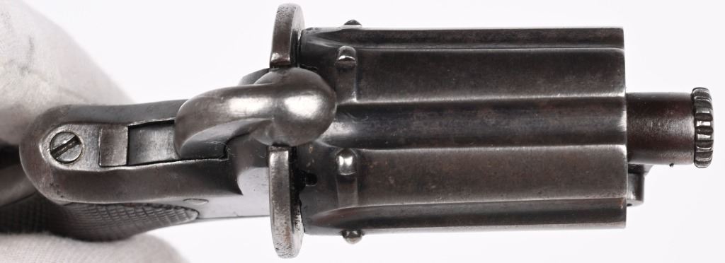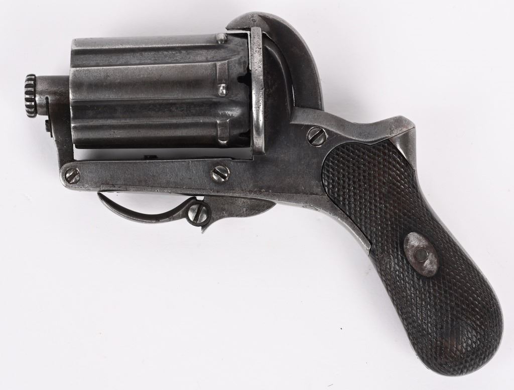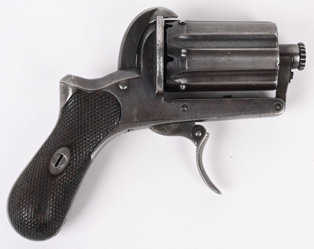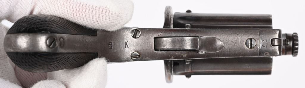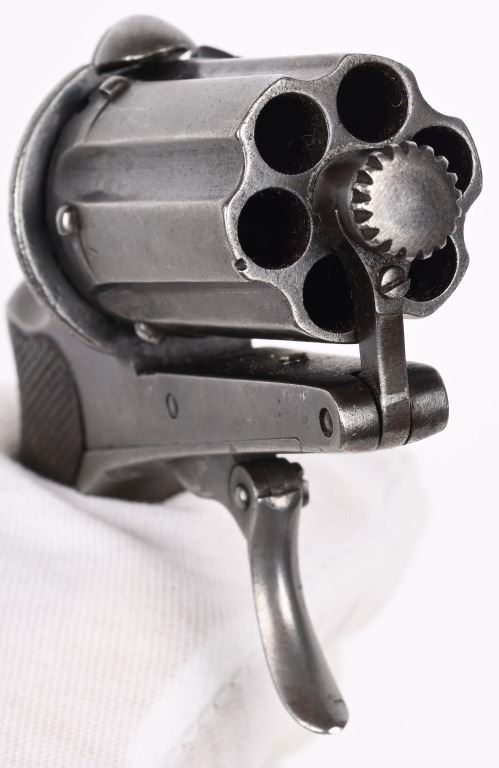 SERIAL NUMBER 77 BARREL 1 3/4" CALIBER 8MM PIN FIRE MANUFACTURED CIRCA 1860'S. Produced by August Francotte, Blue finished with checkered walnut grips. Folding trigger , double action. Long 1 3/4" 6 shot fluted barrel cluster. Unique cylinder removal with hinged front retaining gate. CONDITION. Very good with pistol retaining over 80% thinning blue finish and action operating properly. ANTIQUE
