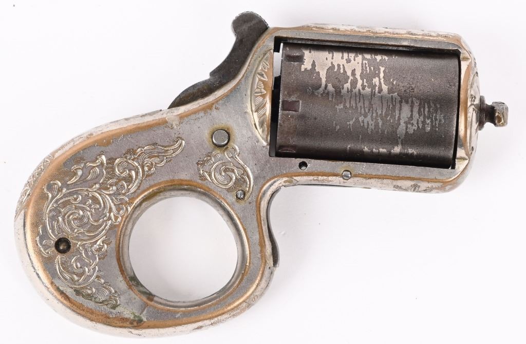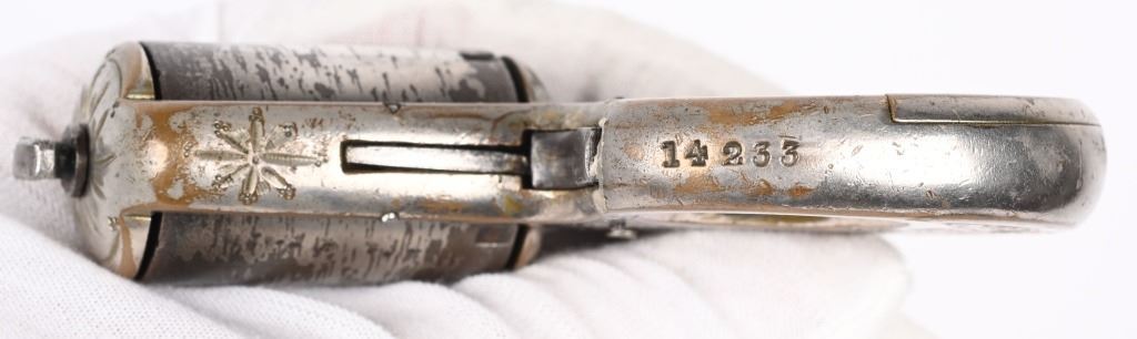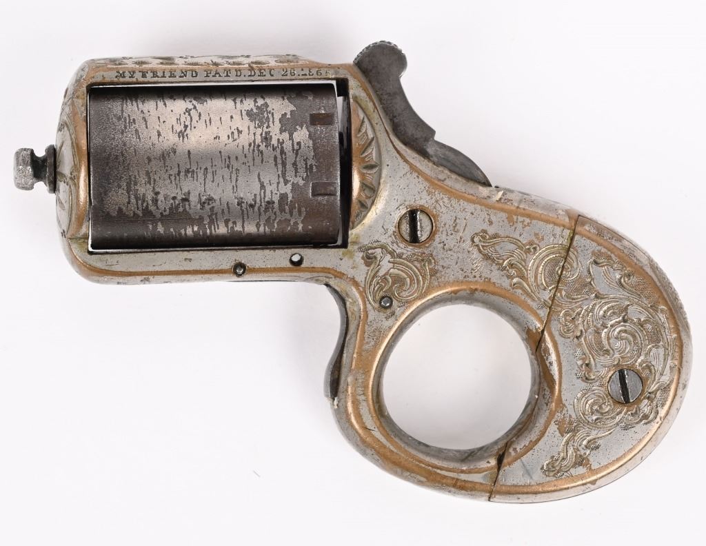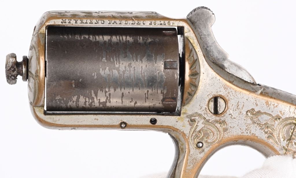 SERIAL NUMBER 14233 BARREL N/A CALIBER .22 RIM FIRE MANUFACTURED CIRCA 1870. Brass frame constriction with 6 shot 22 rimfire barrel cluster. Modestly engraved in broad scrolls. Marked on left side of top strap. "MY FRIEND PATD DEC, 26 1865" . Serial number at base of finger hole and cylinder is unmarked . Late version without sliding safety on bottom of frame. Nickel finished. CONDITION. Good with over 60% nickel finish remaining. Action operates but sometimes hesitates to rotate cylinder. Chambers are good. Markings legible. ANTIQUE