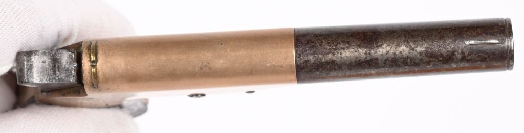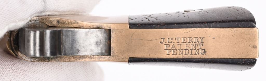 SERIAL NUMBER 528 BARREL 3 3/4" CALIBER 22 RIM FIRE MANUFACTURED CIRCA 1860'S. Produced by J.C. Terry Springfield Mass with an estimated 700 total production. One piece brass frame with round barrel. Marked on backstrap. " J.C. TERRY /PATENT PENDING" serial numbered under 2 piece walnut grips. German silver blade front sight with integral brass rear sight. CONDITION, Good with barrel having toned to a brown patina, brass is an uncleaned mustard patina. Grips are very good and action operational. Bore is dark. ANTIQUE