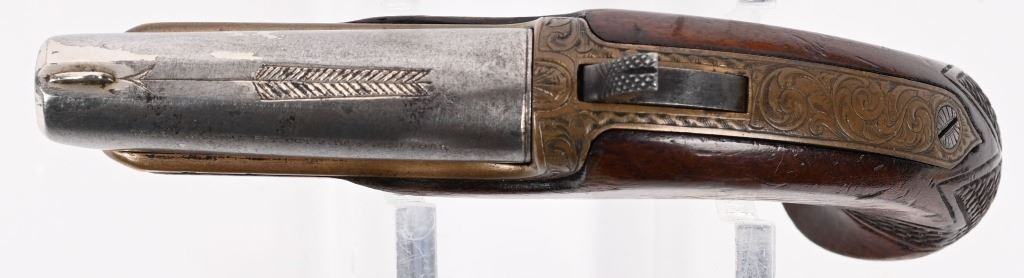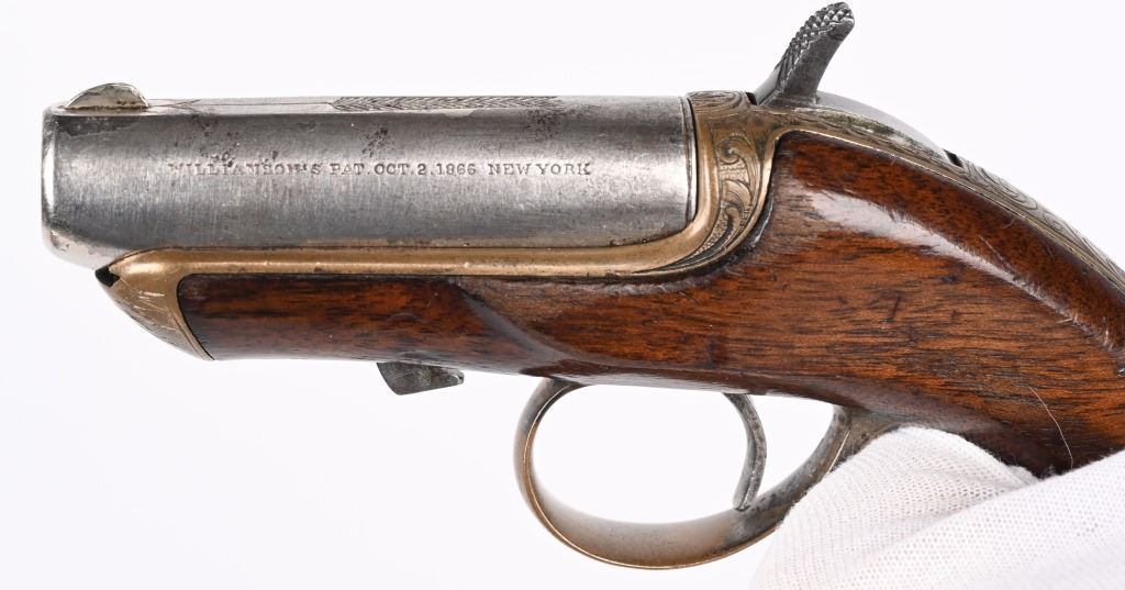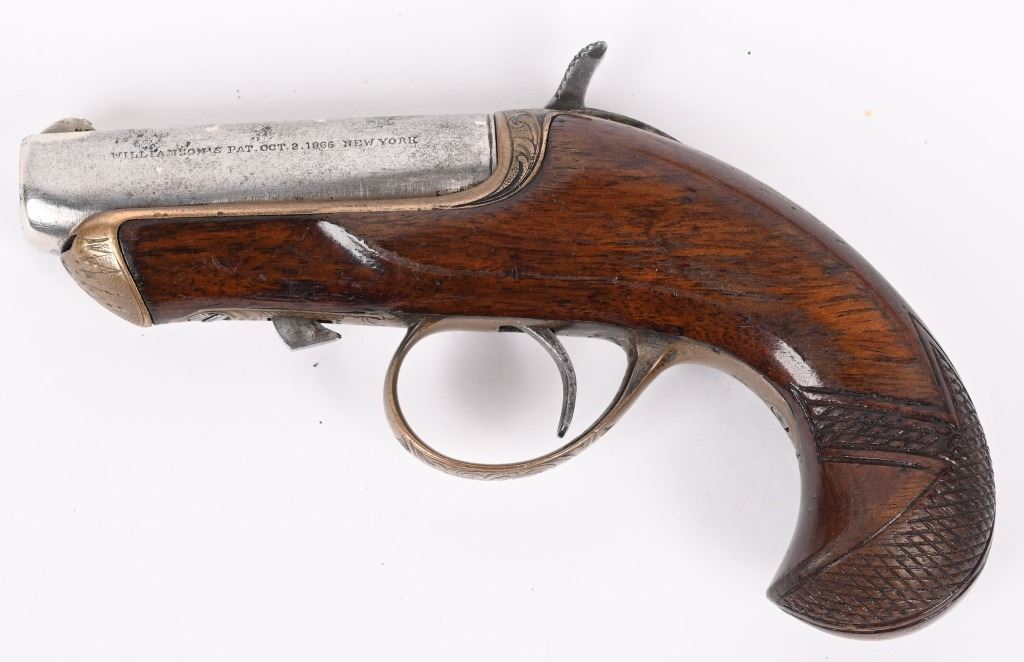 SERIAL NUMBER 1200 BARREL 2 1/2" CALIBER 41 RIM FIRE MANUFACTURED 1866-70. Produced by Moore's Patent firearms of Brooklyn N.Y. (Known for the No1 & No2 Deringers produced by Colt) for David Williamson who was the inventor of this sliding breech pistol.. Varnished checkered walnut stock along the Henry Deringer pattern with nickel finished sliding breech barrel chambered for 41 rim fire.. The pistol was furnished with an auxiliary chamber so could be fired using cap & ball as well. Barrel marked with "WILLIANSON'S PATENT OCT 2 1866 NEW YORK" on left side with a large arrow engraved on the top barrel flat. Brass trigger guard and nose cap with modest engraving. Pistol is complete with auxiliary cap & Ball chamber. CONDITION, Very fine with 40% nickel finish remaining on barrel. Stock is very fine with no cracks and most varnish remaining. Action operates properly. ANTIQUE