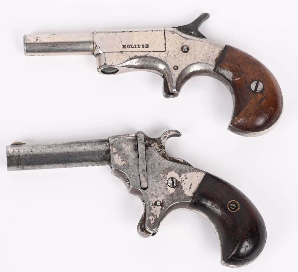(1) Hopkins & Allen .30 cal, rimfire "XPERT" single shot. Serial number 623B with 2 1/4" barrel; marked "XPERT-PAT.SEP.33.1878" Birds head grip with nickel finished iron frame. Scarce pistol with a total production of estimated 4000. CONDITION. Good with dark bore and function action. Grips are good. Bore is dark. ANTIQUE (2) Iver Johnson "ECLIPSE" single shot Deringer cal, 22 rim fire Serial number 6. 2 1/2" barrel with nickel finish and birds head grip with 2 piece walnut stocks. Marked ECLIPSE on left side of breech and "6" on water table. A scarce petite little pocket pistol circa 1870. CONDITION. Good with functioning action. Finish is mottled patina mixed with nickel . Bore is dark. ANTIQUE
