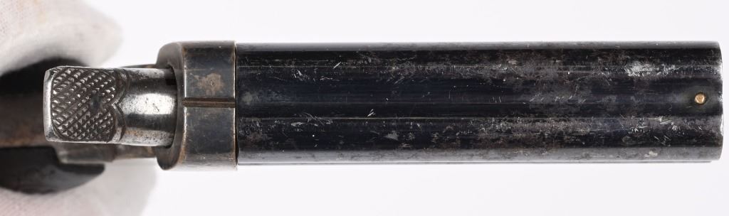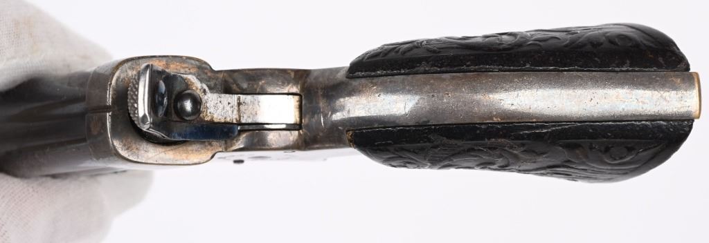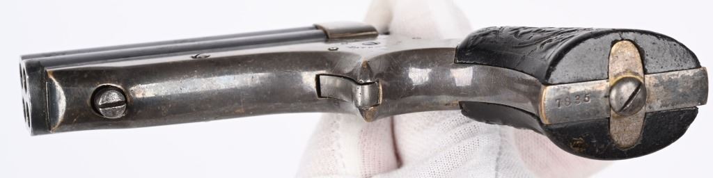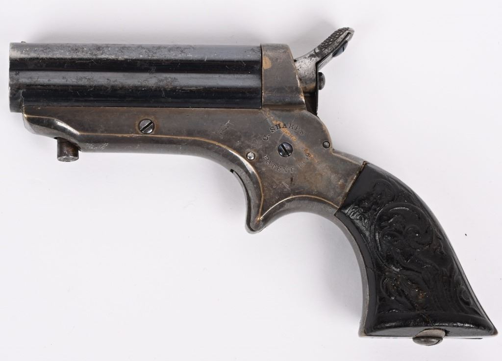 SERIAL NUMBER 7835 BARREL 2 1/2" CALIBER 22 RIM FIRE MANUFACTURED 1859-74. Blue finished 4 shot barrel cluster with silver plated brass frame with traditional Sharps markings. Fancy scroll motif gutta percha grips. Matching numbers.CONDITION, Fine with strong bores with oxidation in grooves. Barrel cluster retains over 95% blue finish. Frame retains over 80% thinning sliver plate finish. Grips are good with moderate external wear and small infernal repair on right grip. Action operates properly. ANTIQUE