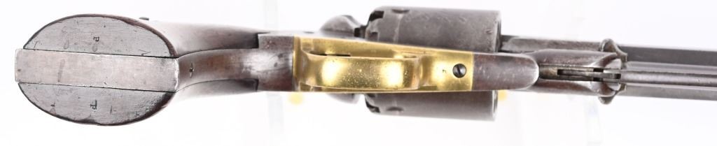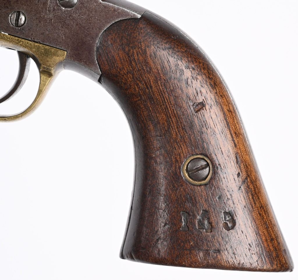 SERIAL 142671. BARREL 8". CALIBER 44. Popular solid frame Civil War revolver. Features an octagon barrel, six shot, single action, brass trigger guard, blue finish, 2-piece walnut grips. Left grip is stamped 145. J inspector stamps on frame. Readable barrel address. Condition. Clean smooth patina. Usual dings on both sides of lever release. Grips are very good. Fine bore and action. ANTIQUE