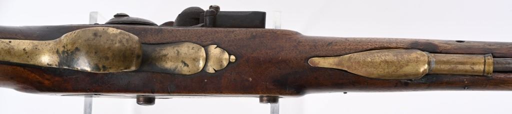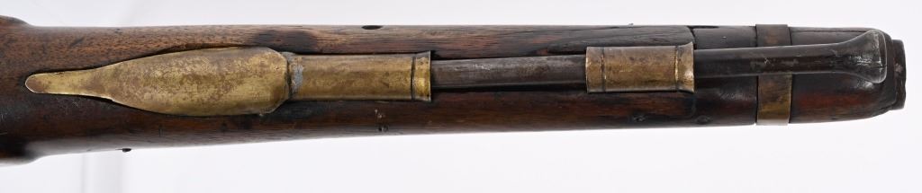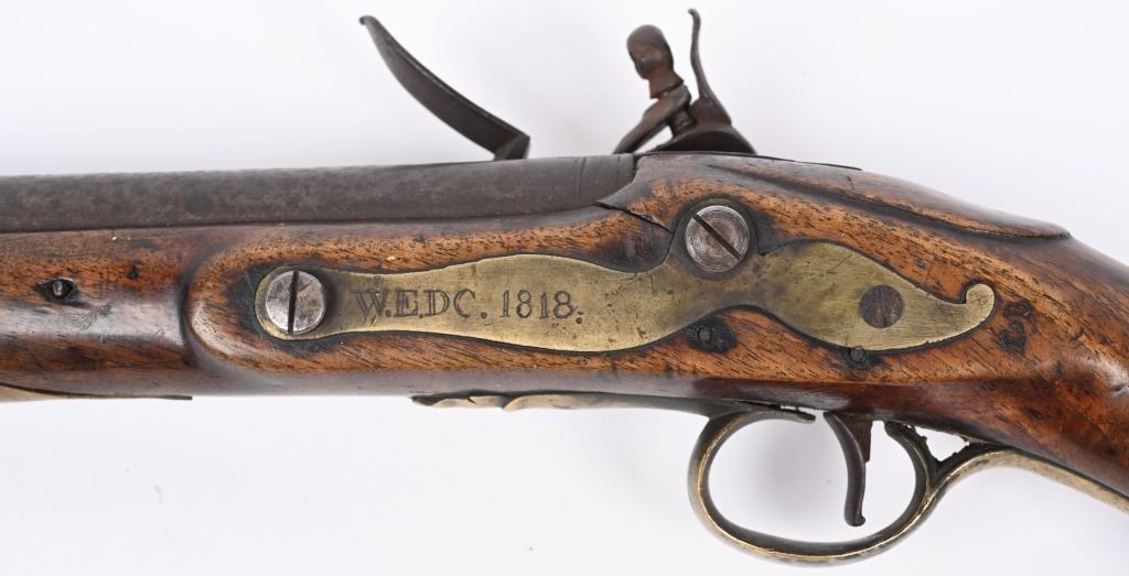 SERIAL NUMBER N/A BARREL 12" CALIBER 62 SMOOTHBORE MANUFACTURED CIRCA 1700's. Crown GR marked Tower lock with 12" tapered round smooth barrel. One piece walnut stock with 2 brass loading rod pipes/ Brass butt cap and trigger guard. Marked "W.E.D.C. 1818" on brass on left side. Believed to be French & Indian war period with later continued use. CONDITION. Good with slight wood loss at front of lock and period of use repairs at rod channel. Lock operates properly. Metal is dark brown uncleaned patina. Bore is dark. ANTIQUE