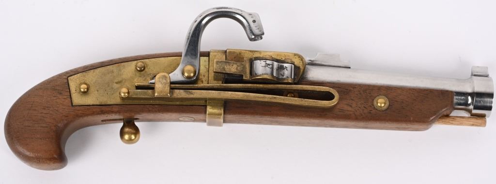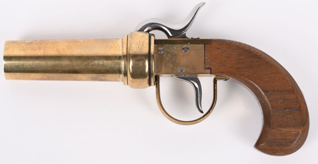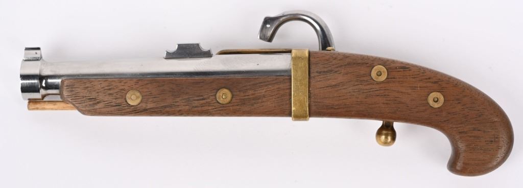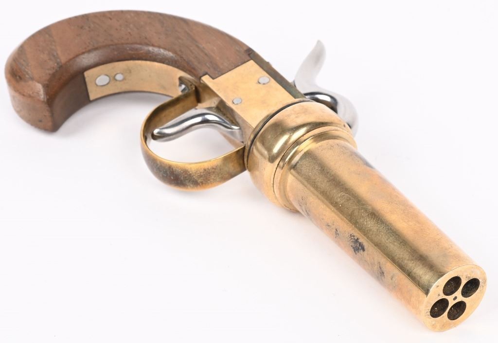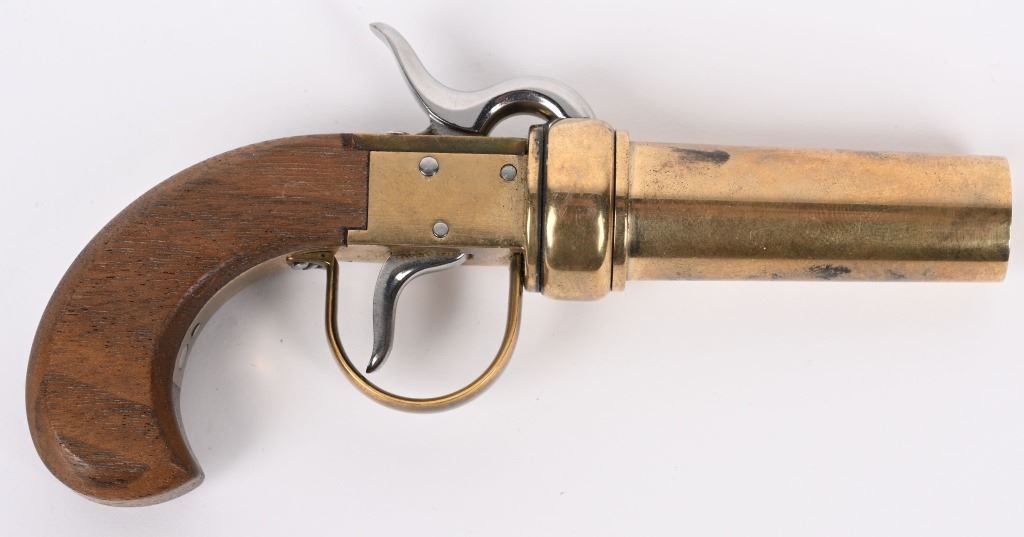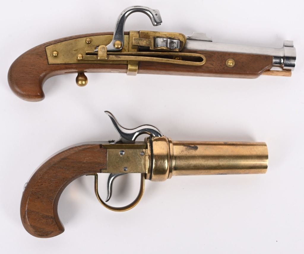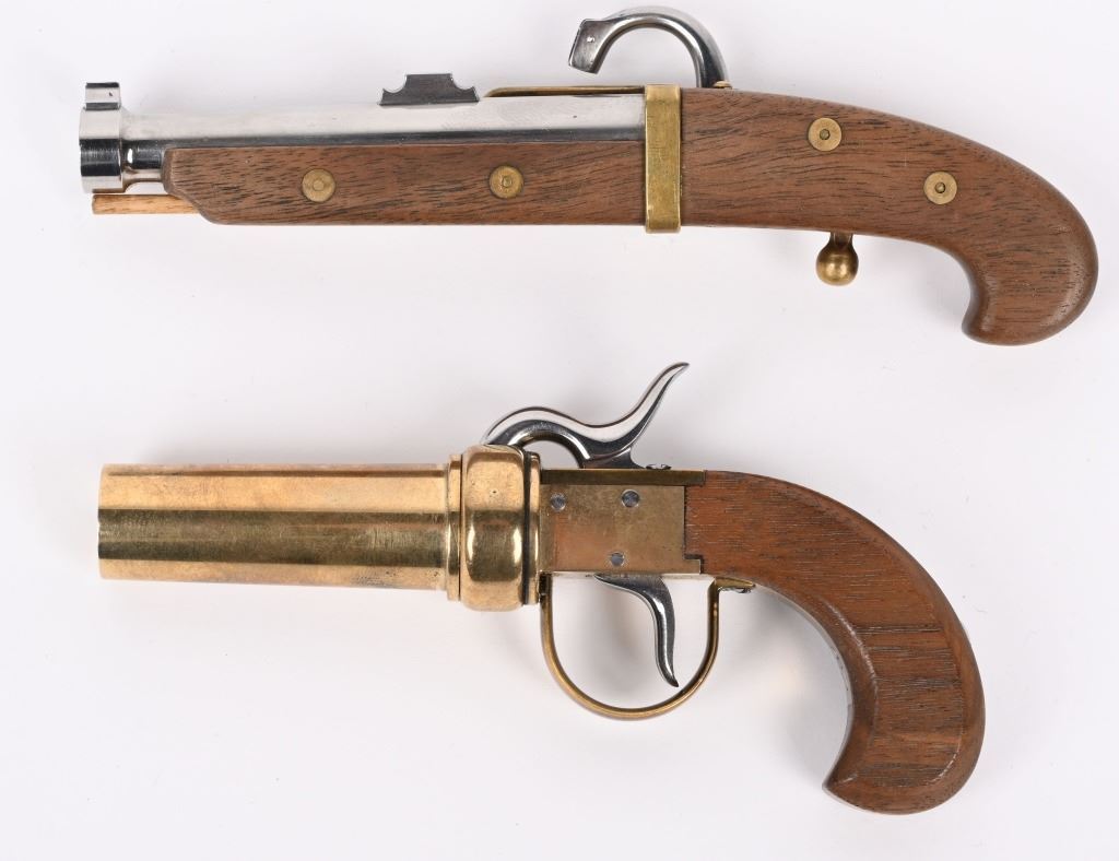 (1) Japanese Netsuke matchlock pistol with iron barrel and brass furniture. 5 3/4" overall length with 15 caliber smooth bore. Walnut one piece stock with brass pins. Fully functional action and appears to be a very proffesionally made one off miniature of unknown origin. (2) Miniature 4 shot percussion pepperbox pistol. Brass barrel cluster with pinned box lock action. Walnut stock with long brass tang. Single action operation with manually operated barrel rotation.5 inches overall and appears to have been hand made by the same maker as the Japanese Matchlock. 15 caliber 4 shot barrel cluster with no markings or identifying markings. A wonderful previously unknown set of miniature handguns. ANTIQUE