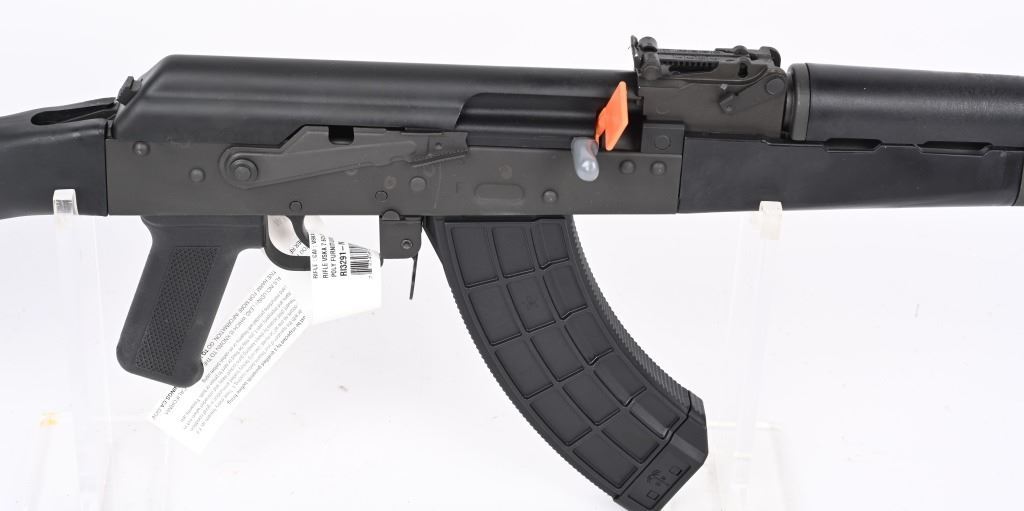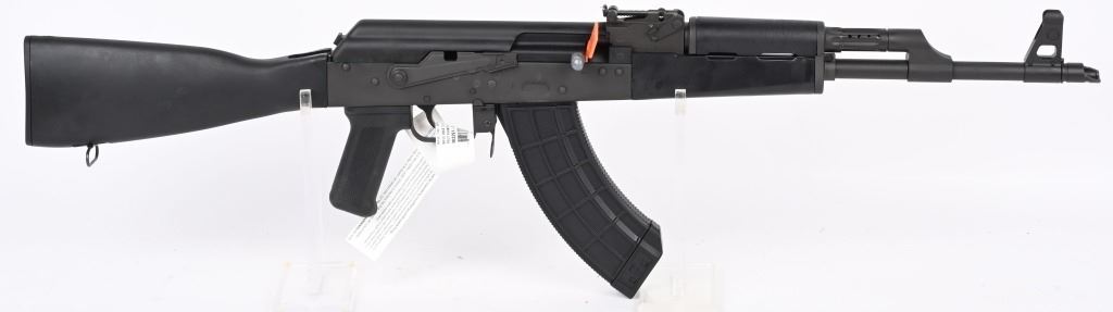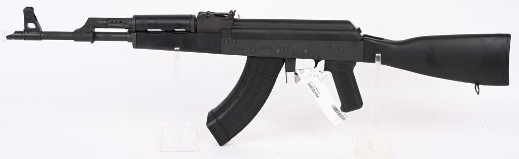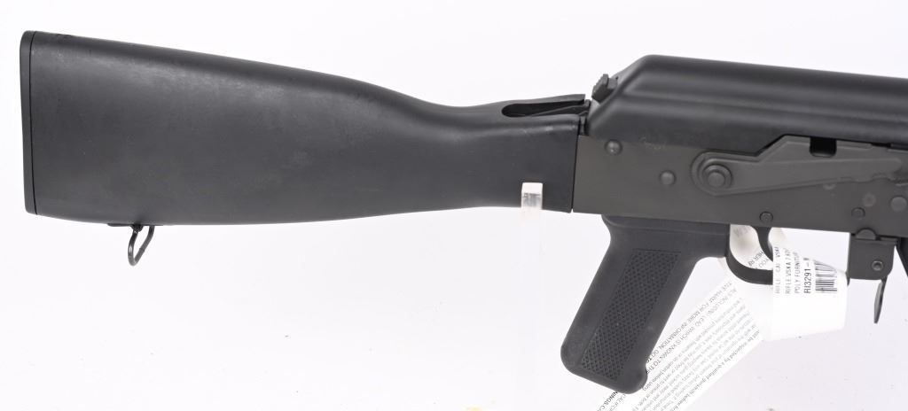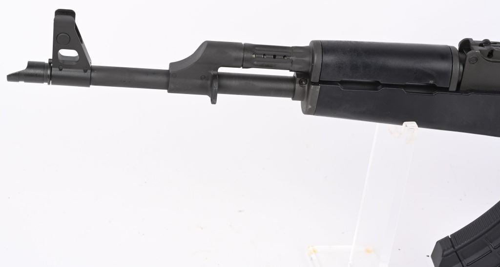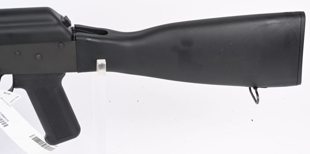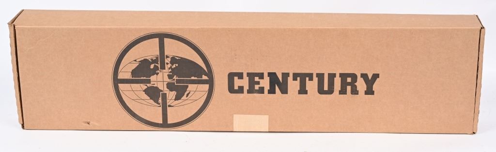 SERIAL NUMBER: SV7060124. BARREL: 16". CALIBER: 7.62X39. MANUFACTURED: 2021. American made AK-47, by Century Arms. Threaded muzzle with slant cut muzzle break. Post front sight and rear ladder. Parkerized finish and black polymer finish. Includes serial matching box, manual and 30 round polymer magazine. CONDITION: Excellent overall, with little signs of handling or use. Bore is shiny with crisp rifling. Possibly un-fired from the factory. Fine mechanics. Box is excellent. MODERN