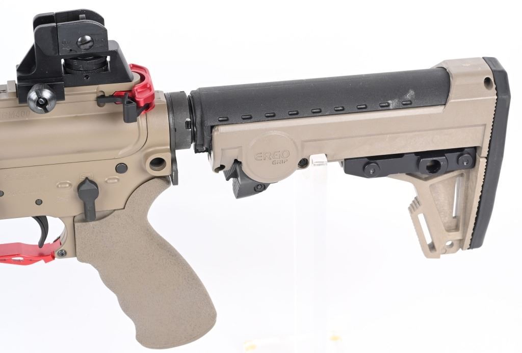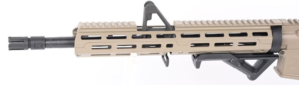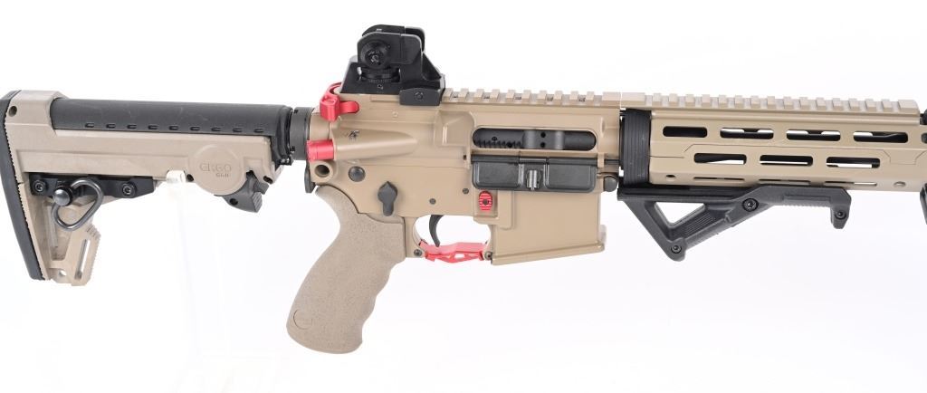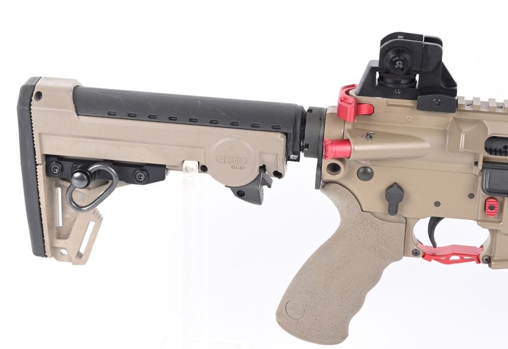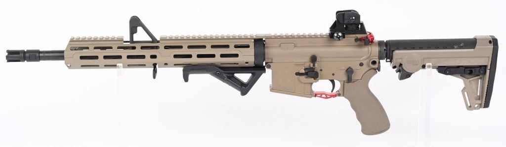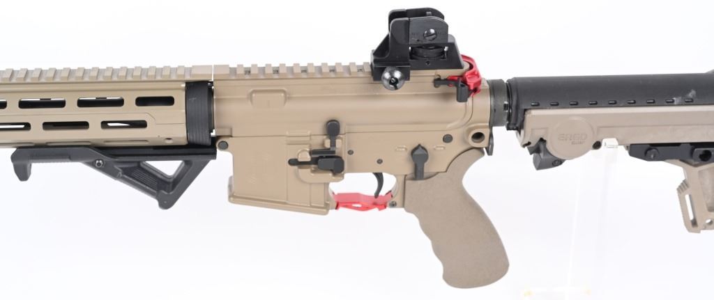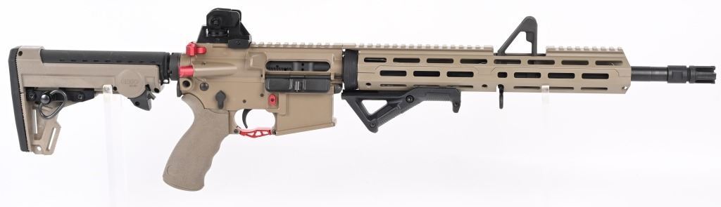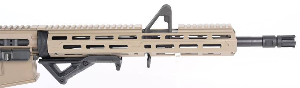 SERIAL NUMBER: 20K010076. BARREL: 16". CALIBER: 5.56X45MM. MANUFACTURED: 2020s. Barrel is marked "5.56 NATO 1/7". Fixed gas block/front sight. Removable A2 adjustable rear. Full MLock front rail. Black polymer angled foregrip. Tan anodized finish. Charging handle, forward assist, trigger guard and mag release are red anodized replacements. Seven position ERGO Grip stock. Tan rubberized grip. No magazine included. CONDITION: Metal and furniture are excellent overall, with a few handling marks. There are scratches above the forward assist port. Bore is shiny with crisp rifling. Mechanically fine. MODERN