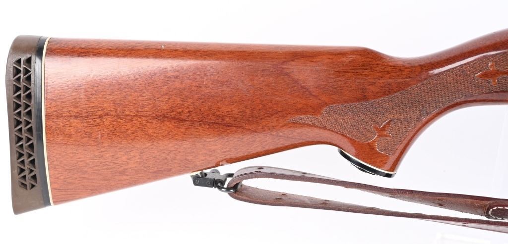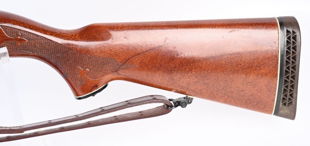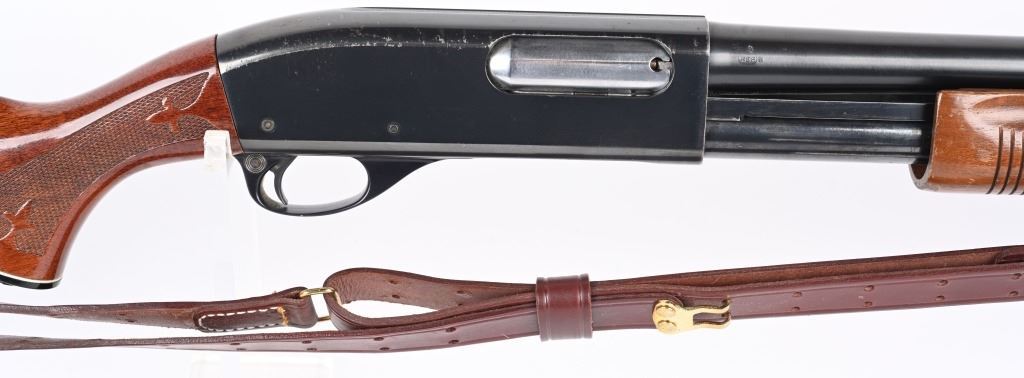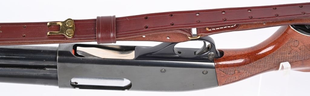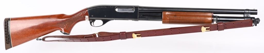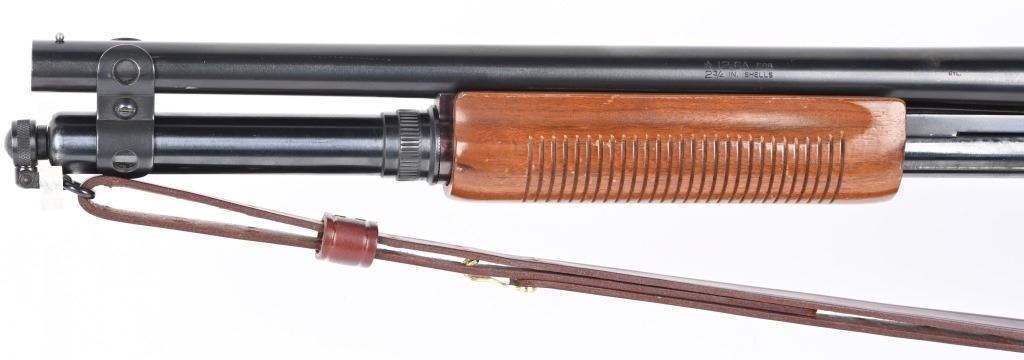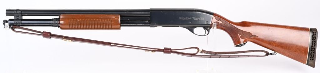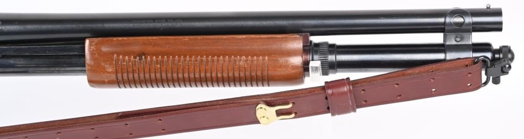 SERIAL NUMBER: S983140V. BARREL: 18-1/2". CALIBER: 12 GAUGE. MANUFACTURED: 1977. Set up in police/riot configuration. No police markings appear to be present. Bead front sight. Extended magazine tube, going to the end of the muzzle. Factory blued finish and lacquered wood stock/fore arm. Capped pistol grip and factory broom rubber recoil pad. Includes attached generic leather sling. 2-3/4" chamber. Cylinder choke bore. LOP is: 14". CONDITION: Metal is good-very good overall with finish wear and handling marks. Wood has scratches and handling marks. Bore is clean overall. Mechancially fine. MODERN