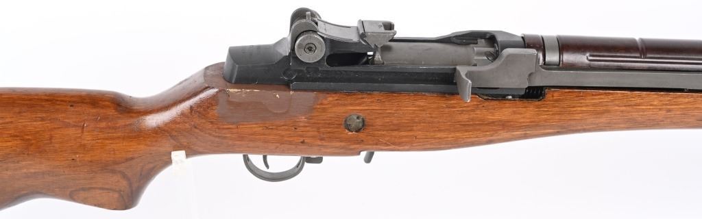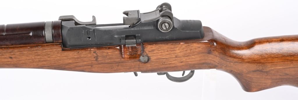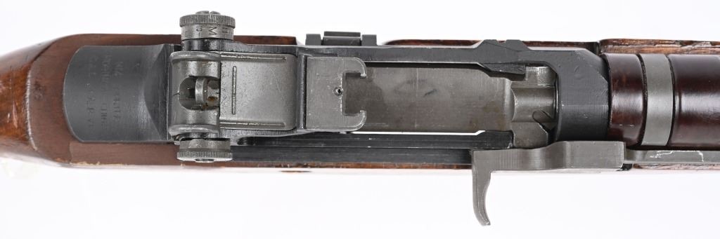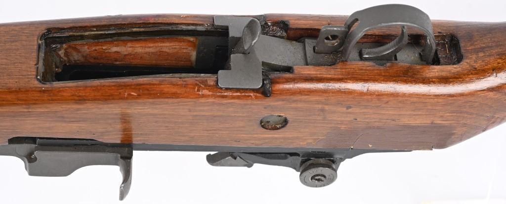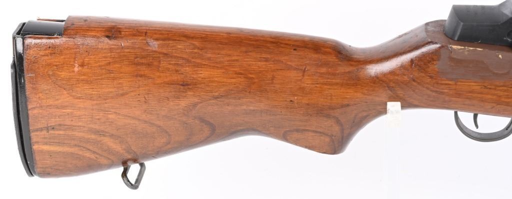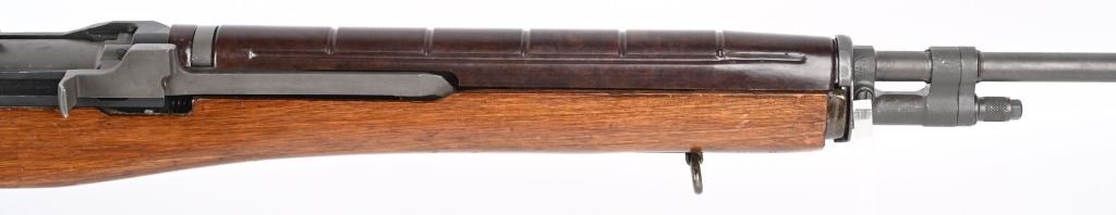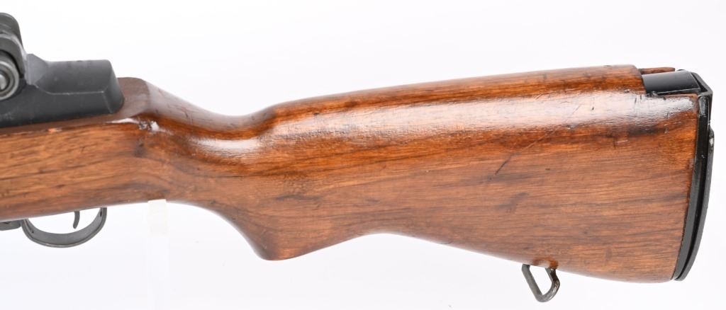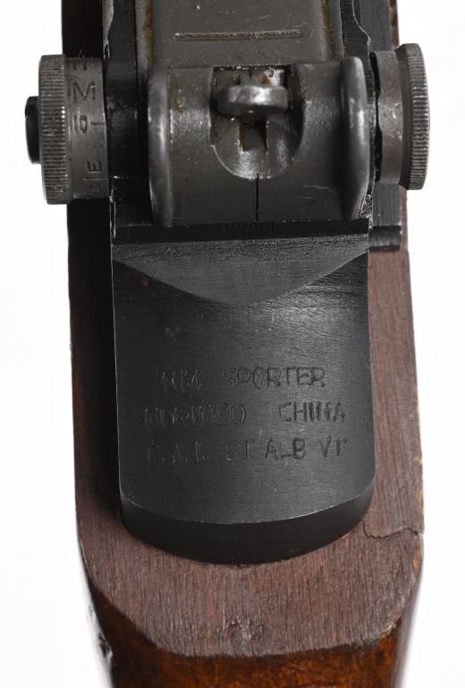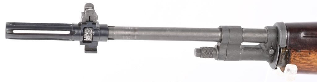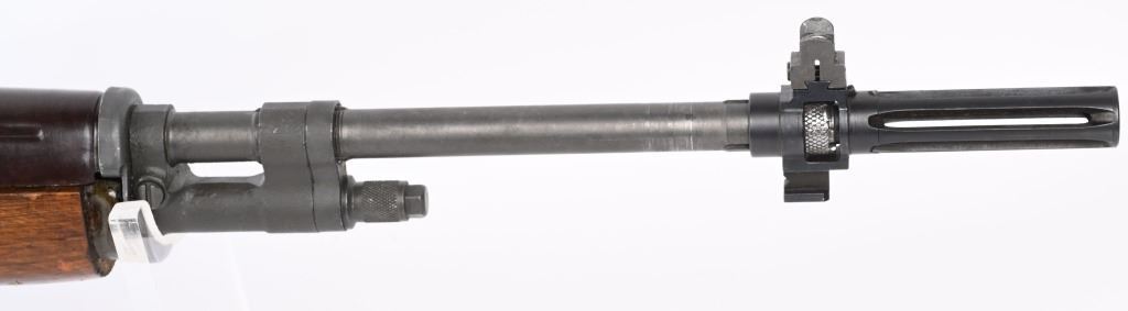 SERIAL NUMBER: C07845. BARREL: 22". CALIBER: .308 WIN. MANUFACTURED: 1990's. Copy of the M1A/M14 rifle, being made in China in the early 1990s. Added flash hider/bayonet lug. Blade front sight and adjustable peep rear. Original parkerized finish. Oiled wood stocj and fiber glass hand gaurd. Flip up metal butt plate. No magazine included. CONDITION: Metal is very good overall, with minor handling marks and scratches. Wood has minor scrapes and scratches. Bore is shiny with crisp rifling. Fine mechanics. MODERN