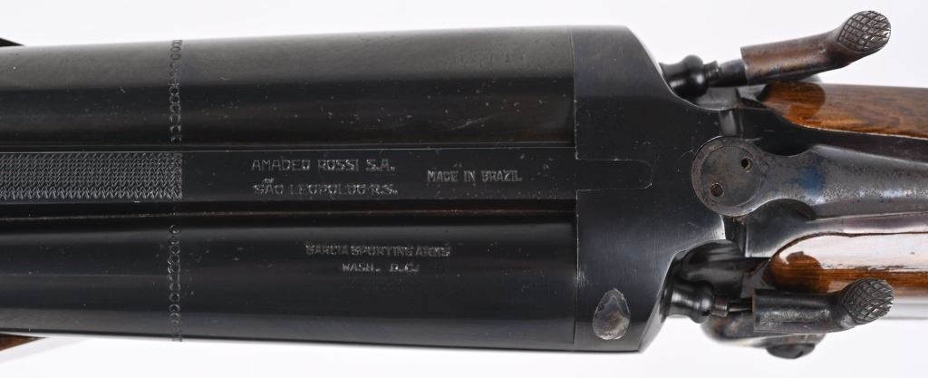 SERIAL NUMBER: S12531. BARREL: 26". CALIBER: 16 GAUGE. MANUFACTURED: 1980's. Made in Brazil and imported by Garcia Sporting goods. Solid rib and bead front sight. Blued finish and oiled wood furniture. Exsposed double hammers and triggers. 2-3/4" chambers. Full/Modified choke bores. LOP is: 14-1/4". CONDITION: Metal is very good overall, with little wear. There are a few freckles of surface rust though. Wood has minor handling marks, scrapes and scratches. Bores are shiny. Hammers and lockup are tight. MODERN
