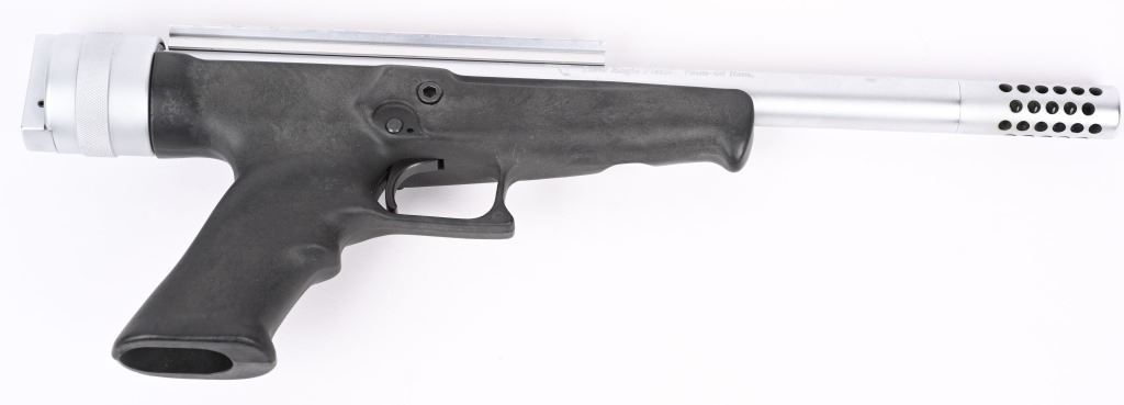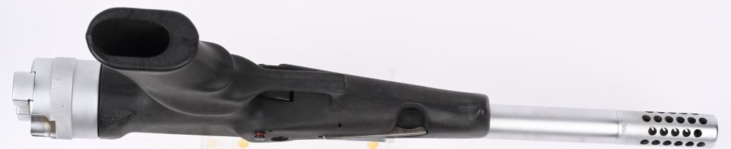 SERIAL NUMBER: A00985. BARREL: 14". CALIBER: 7MM-08. MANUFACTURED: 1990'S. Heavy bull barrel designed for target shooting and hunting. Threaded muzzle and ported muzzle break. Scope rail on the top of the barrel. Matte stainless finish and black polymer frame. Includes original box and Leupold FX-II 4X28MM Handgun scope. CONDITION: Metal is excellent overall, with a few handling marks. Frame is excellent as well. Bore is shiny with crisp rifling. Scope is excellent, with a clear optic. MODERN