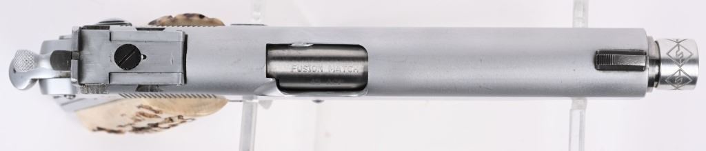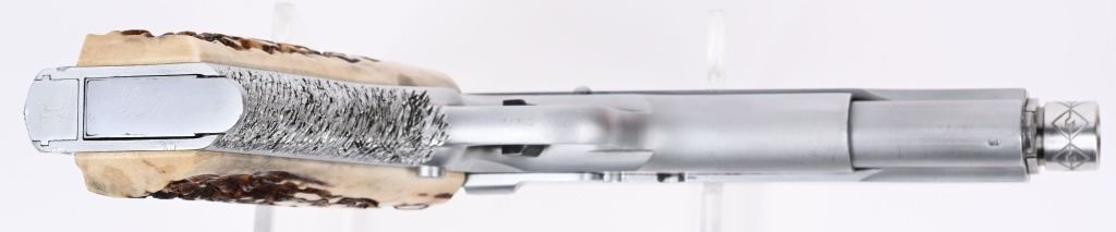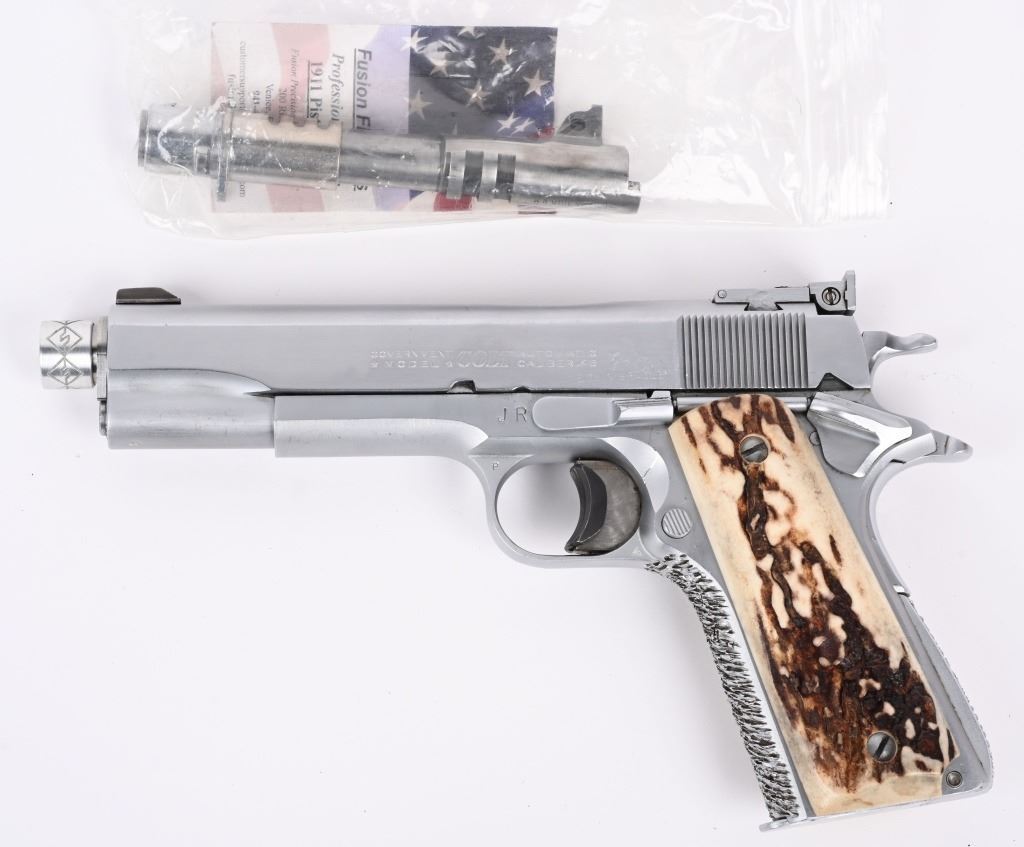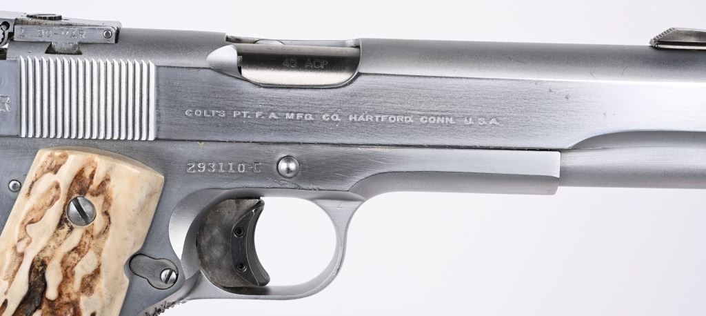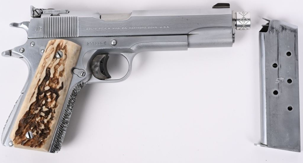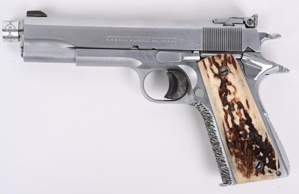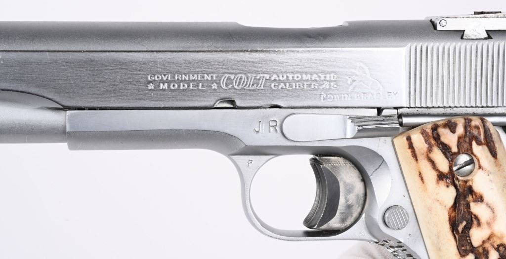 SERIAL NUMBER: 293110-C. BARREL: 5-1/2". CALIBER: .45 ACP. MANUFACTURED: 1963. Standard model markings on the slide, with and added "JR' on the right, and "EDWIN BRADLEY" on the bottom. "JR" is marked on the frame as well. "VP" proof on the trigger guard. Fusion match barrel, with a threaded muzzle. Blade front sight and u-notch rear. Matte nickel finish. Added trigger shoe on the trigger. Very thick cut checkering on the front and rear grip straps. Stag style grips. Includes a matte nickel finished magazine, with an "L" on the lip. Includes extra Colt marked .45 ACP barrel, 5". CONDITION: Metal is very good overall, with light wear and scratches. Grips have light wear. Bore is shiny with crisp rifling. Will need adjustment, as the hammer follows the slide home. Magazine has light finish wear. Extra barrel is clean with strong rifling. C&R