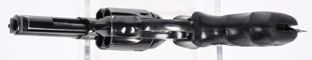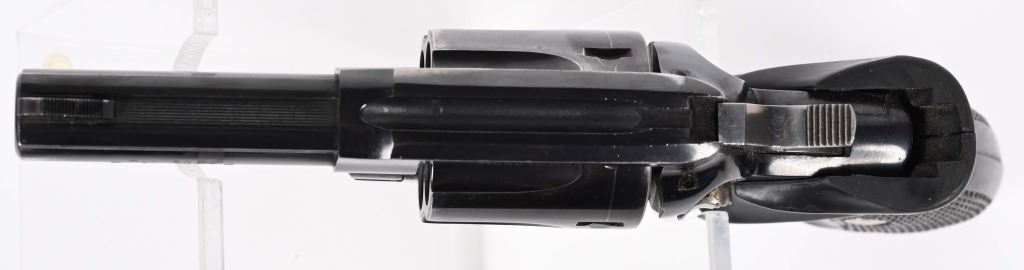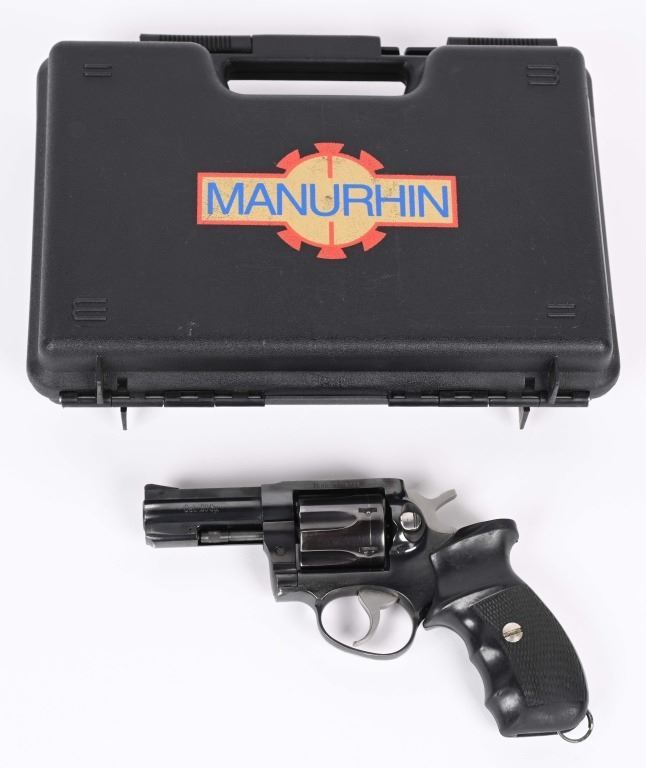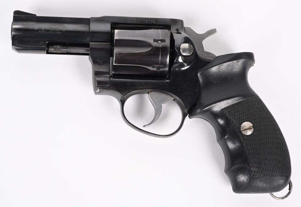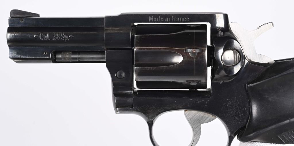 SERIAL NUMBER: FDO3682. BARREL: 3". CALIBER: .38 SPECIAL. MANUFACTURED: 1990'S. Made in France and imported by "SJI" as marked on the barrel. Six shot fluted cylinder. Solid rib, with blade front sight and u-notch rear. Factory blued finish and checkered rubber grips. Lanyard ring stud is present, as is the ring. Includes an original hard plastic case. CONDITION: Metal is very good overall, with light scratches and handling marks in the finish. Grip has light wear. Bore is shiny with crisp rifling. Sharp mechanics. Case has light wear. MODERN