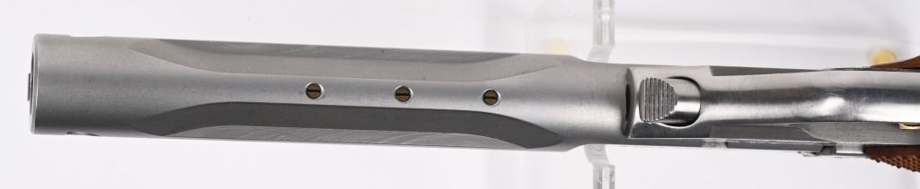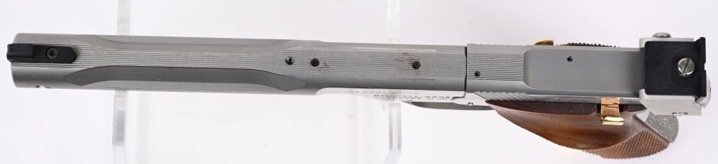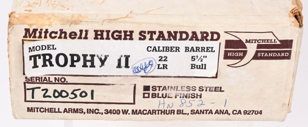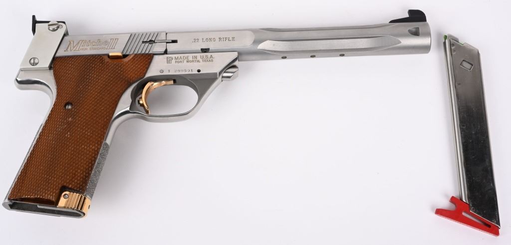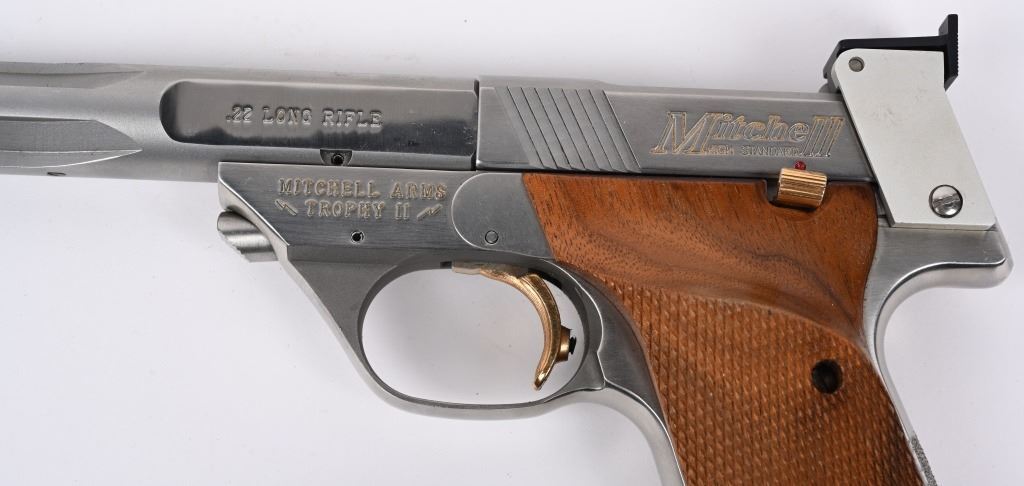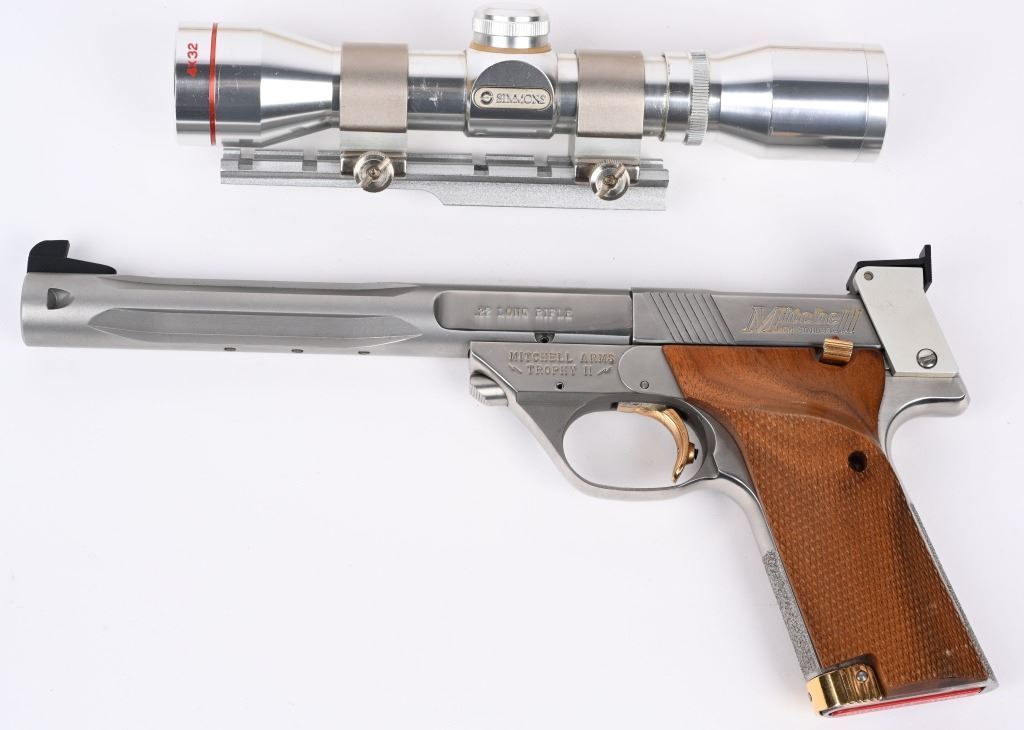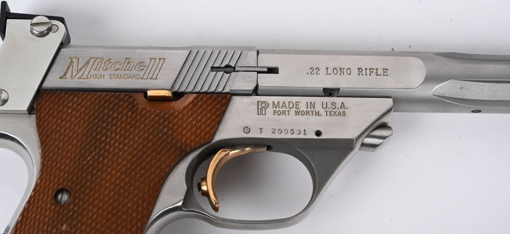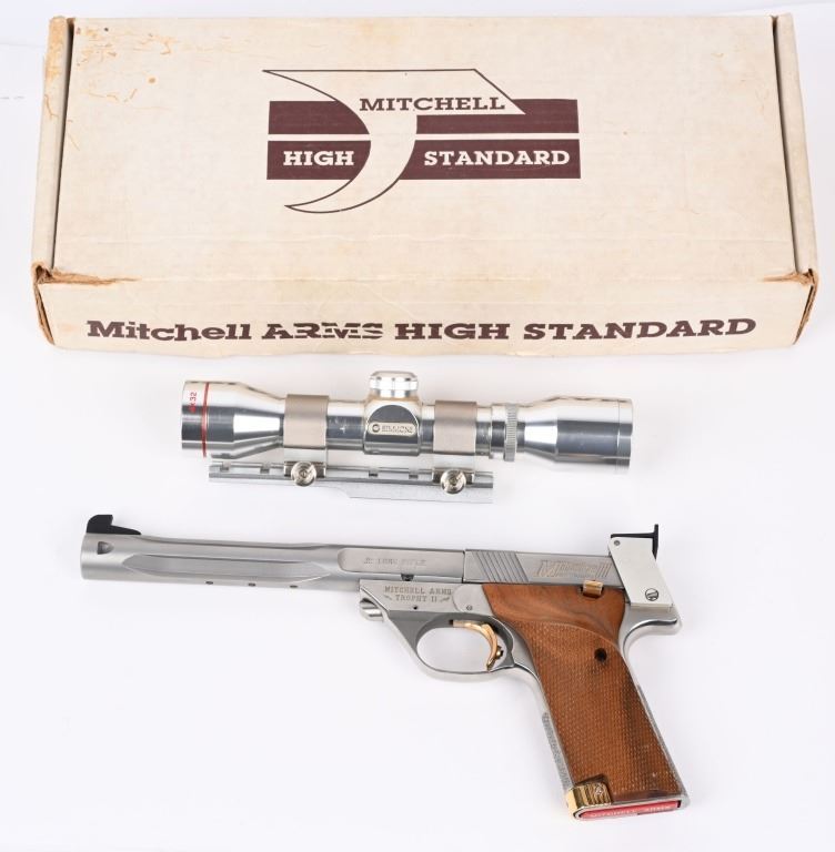 SERIAL NUMBER: T200501. BARREL: 7-1/4". CALIBER: .22LR. MANUFACTURED: 1990'S. Made by Mitchell Arms under the High Standard name. Fluted barrel with ramped blade front sight and u-notch rear. Polished stainless finish and gold washed small parts. Original checkered wood grips. Barrel has added scope mount and Simmons 4X32 pistol scope. Original polished magazine. Includes original box. Barrel length on the box does not match the actual barrel. CONDITION: Metal and grips are excellent overall. Bore is shiny with crisp rifling. Sharp mechanics. Scope is excellent, as is the box. MODERN