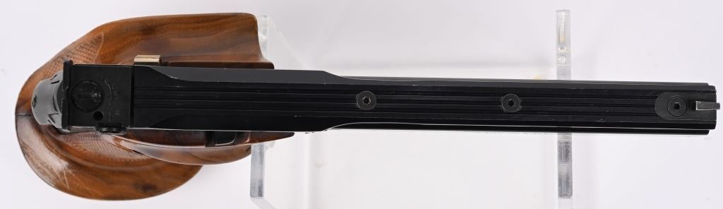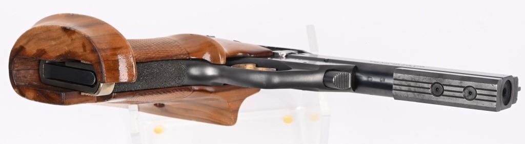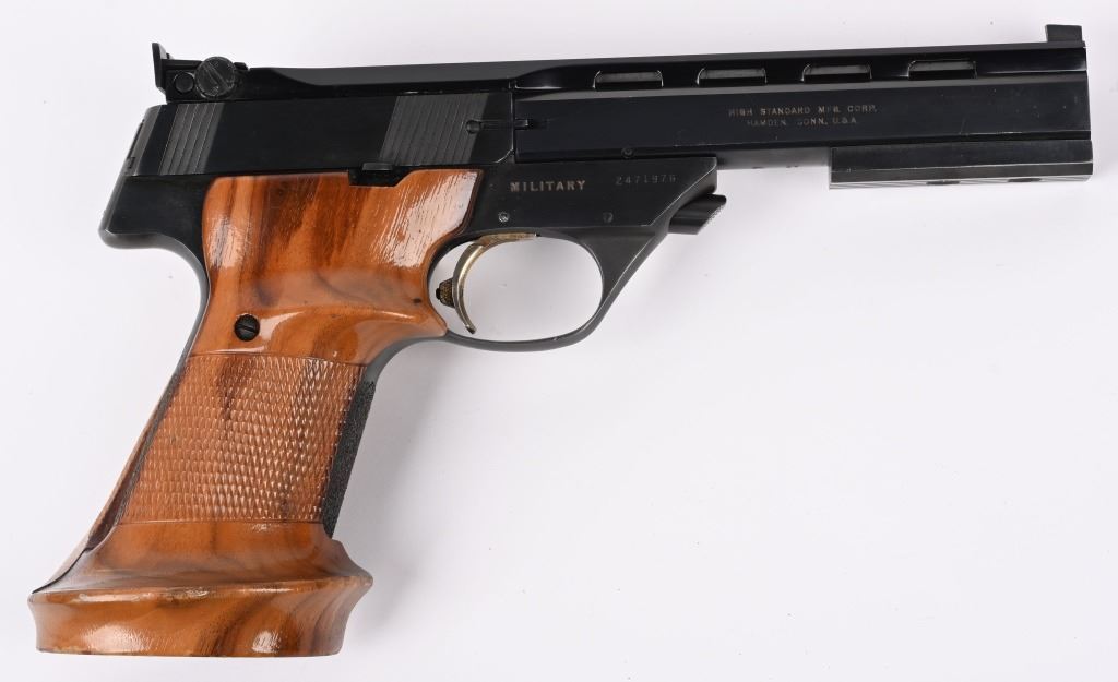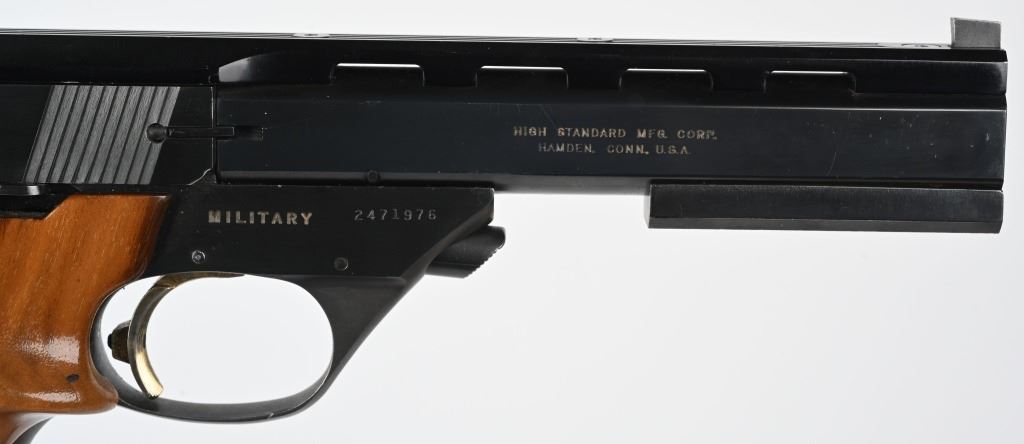 SERIAL NUMBER: 2471976. BARREL: 5-1/2". CALIBER: .22LR. MANUFACTURED: 1970'S. "MILITARY" marked frame. Standard markings on the barrel. Full sight rib on the top of the barrel/slide. Original blued finish and oiled wood grip. Factory gold washed small parts. Original blued steel magazine. CONDITION: Metal is very good overall, with light wear and a few handling marks. Grip has light wear. Bore is shiny with crisp rifling. Magazine has light wear. Sharp mechanics. MODERN