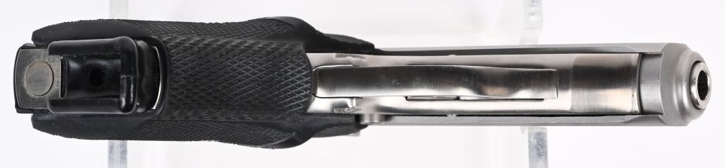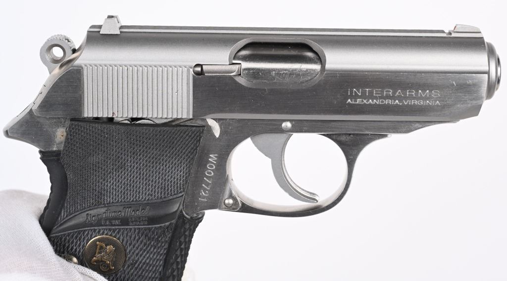 SERIAL NUMBER: W007721. BARREL: 3-1/4". CALIBER: .32 ACP. MANUFACTURED: 1990'S. Extremely uncommon Stainless steel American Made Walther PPK/S chambered for the 7.65 / .32 acp cartridge. Made by a subsidiary of Interarms, being licensed by Walther. Standard markings and sights. Polished stainless finish. After Market Pachmayr rubber grips. Factory nickel eight round metal magazine. CONDITION: Excellent overall, with a few light scratches. Bore is shiny with crisp rifling. Magazine is excellent. MODERN
