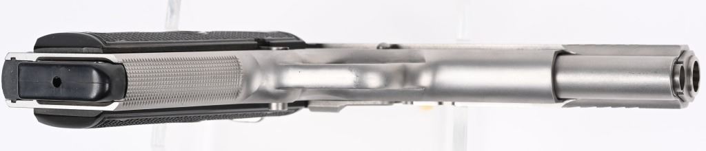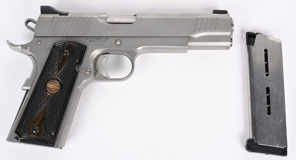 SERIAL NUMBER: AOB00030. BARREL: 5". CALIBER: .45 ACP. MANUFACTURED: 2000'S. Blade front sight and u-notch rear. Matte stainless finish and checkered wood grips. Includes Wilson combat 7 round magazine. CONDITION: Metal is excellent overall, as are the grips. Bore is shiny with crisp rifling. Fine mechanics. Magazine is excellent. MODERN