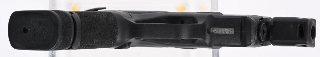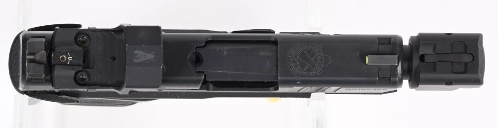 SERIAL NUMBER: BA145354. BARREL: 3-3/4". CALIBER: 9X19. MANUFACTURED: 2020's. Threaded barrel with ported compensator acting as a thread protector. Standard iron sights and Hex Wasp red dot. Blued slide, and black polymer frame. Includes factory 13 round magazine. CONDITION: Excellent overall, with a few minor scratches. Bore is shiny with crisp rifling. Magazine is excellent. MODERN