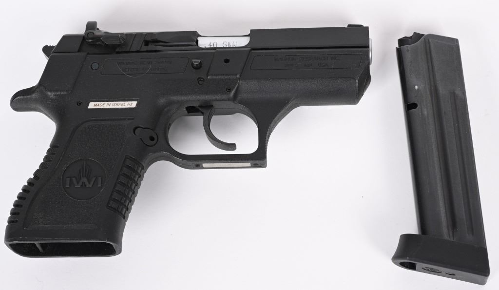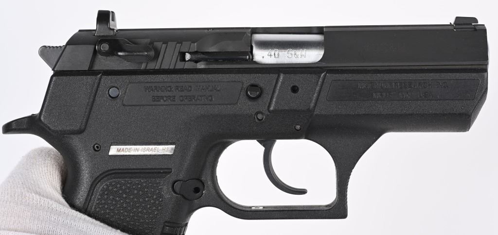 SERIAL NUMBER: 36320286. BARREL: 3-1/2". CALIBER: .40 S&W. MANUFACTURED: 2000's. Made in Israel. 3-dot sights. Phosphate finished slide. Black polymer frame. Includes 10 round magazine. Magazine does not fit flush. CONDITION: Metal and frame are excellent overall, with a few handling marks. Bore is shiny with crisp rifling. Magazine is excellent. MODERN