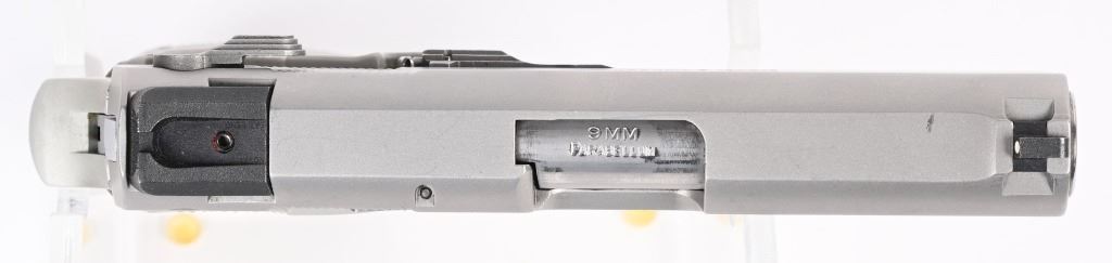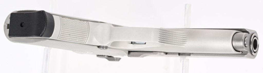 SERIAL NUMBER: TFB4133. BARREL: 3-1/2". CALIBER: 9MM LUGER. MANUFACTURD: 2000's. Standard low profile sights. Matte stainless finished slide and gray alloy frame. Grey checkered plastic grips. Includes factory 8 round single stack magazine. CONDITION: Metal and grips are excellent overall, with a few handling marks. Bore is shiny and crisp. Mechancially fine. Magazine is excellent. MODERN.