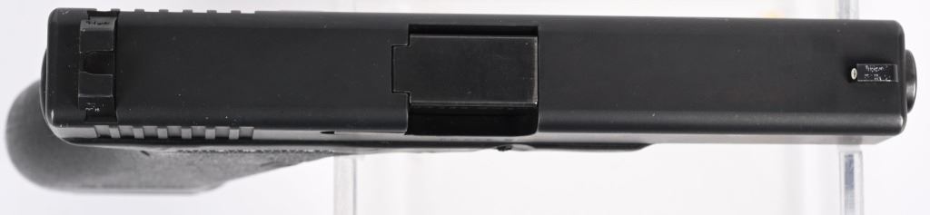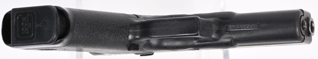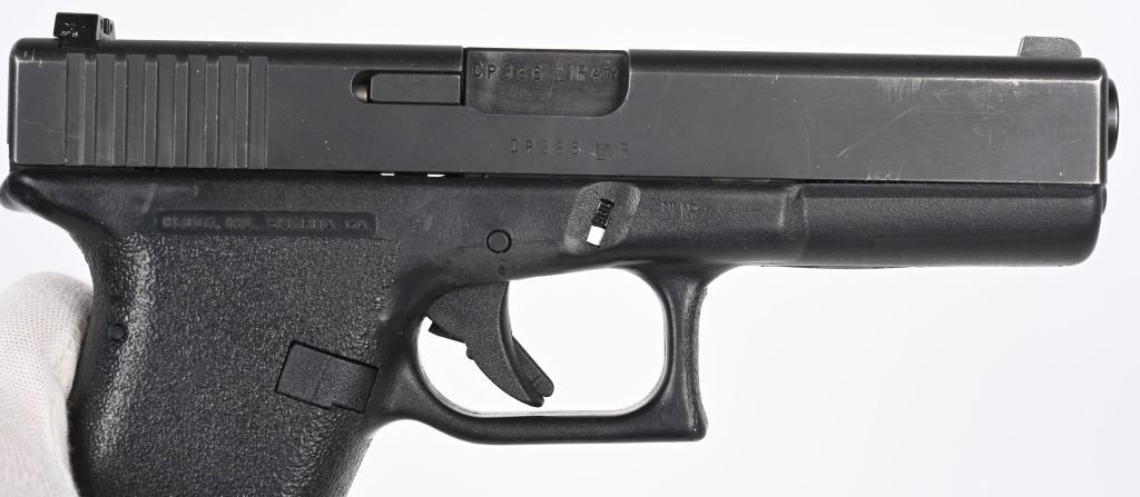 SERIAL NUMBER: CP366US. BARREL: 4-1/2". CALIBER: 9MM LUGER. MANUFACTURED: 1987. Made in Austria. Matching serials on the frame, slide and barrel. Standard 3-dot sights, matte finished slide, and black polymer frame. Includes one factory 17 round magazine, and original Tupperware case. No manual or end label on the case. CONDITION: Metal is very good overall, with light wear. Frame has light handling marks and scratches. Bore is clean overall, with very good rifling. Magazine has light handling marks. Case has exterior wear. MODERN