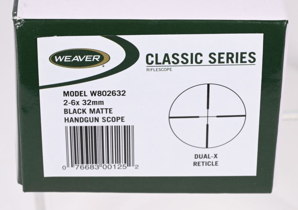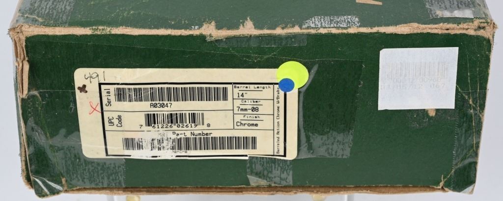 SERIAL NUMBER: A03047. BARREL: 14". CALIBER: 7MM-08 REM. MANUFACTURED: 1990's. Unique locking and cocking design. Scope rail added. Factory chrome finish and black polymer grip. Includes original box, soft case and Weaver 2-6X32MM Handgun scope. CONDITION: Metal and grip are excellent with a few handling marks. Bore is clean overall with strong rifling. Mechanically fine. Box has exterior wear. Scope looks to be nearly new, being in the original box. MODERN