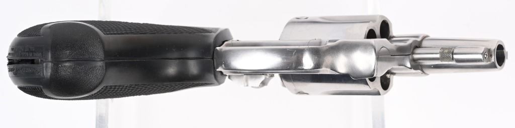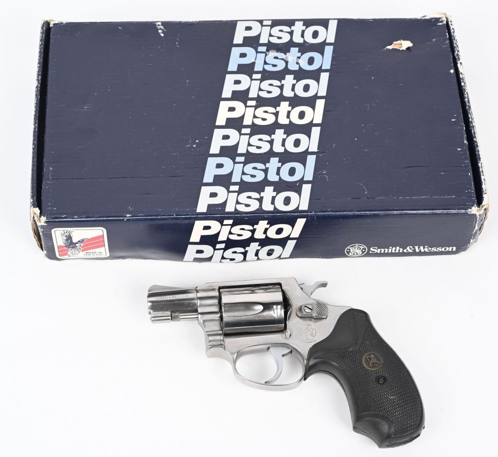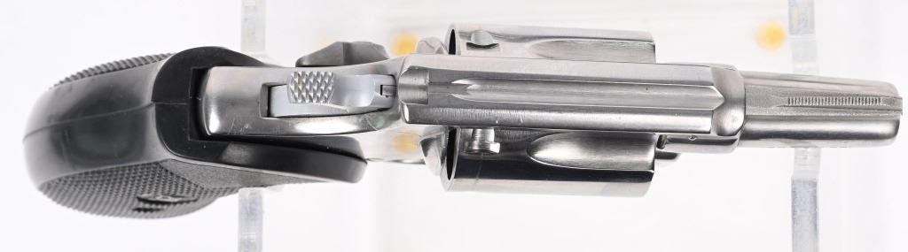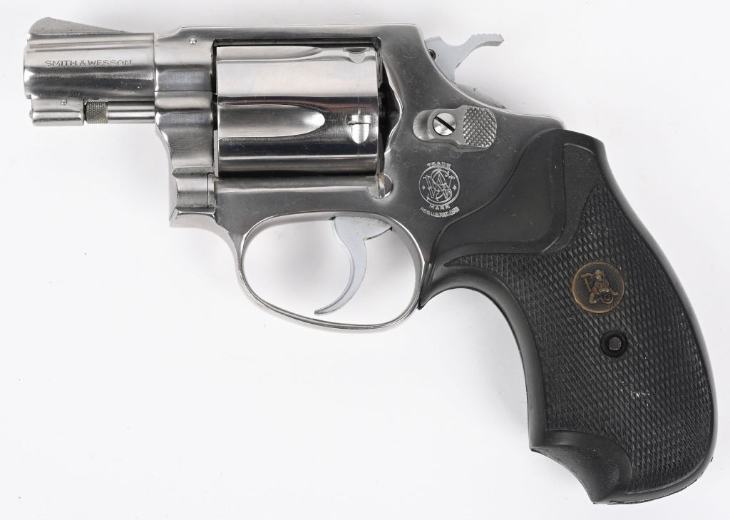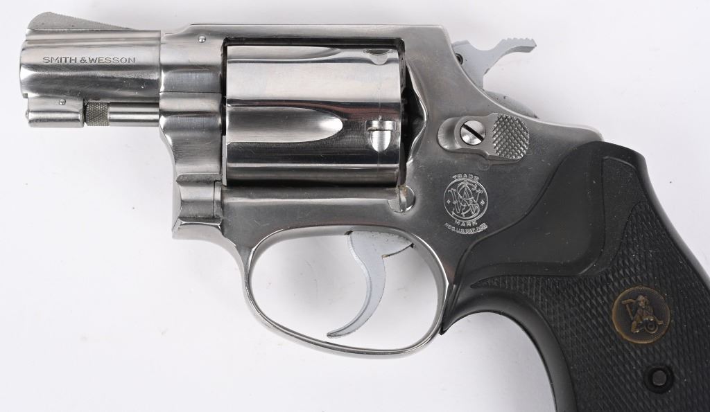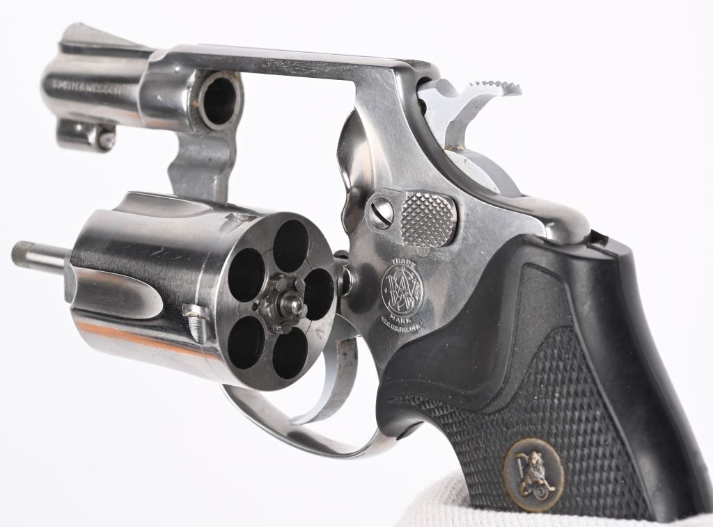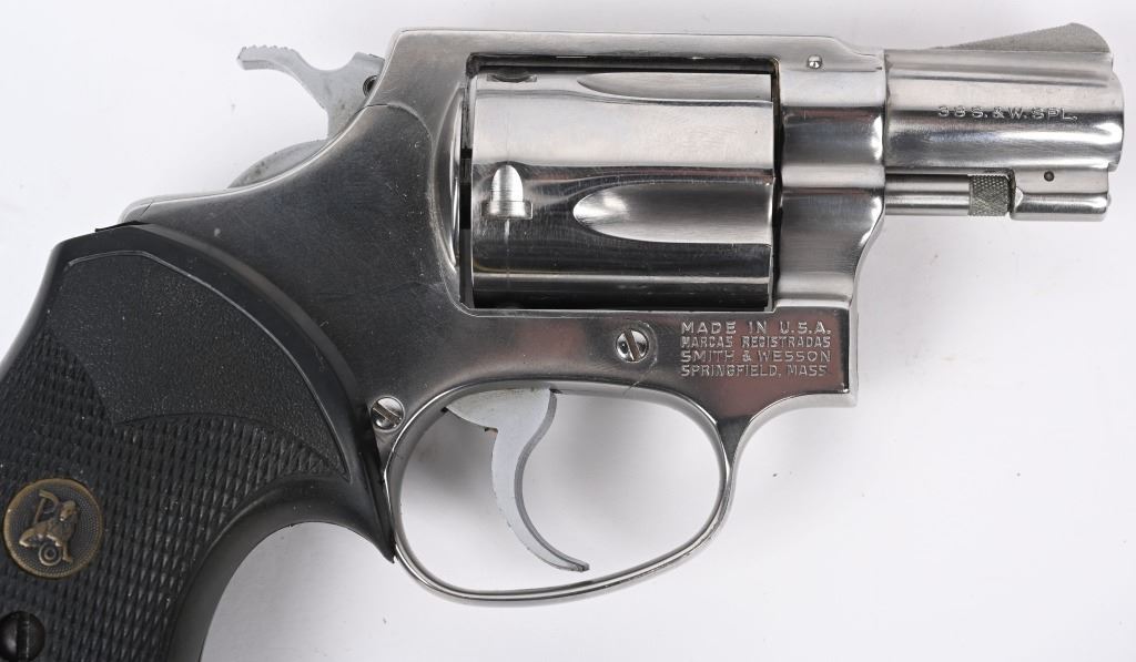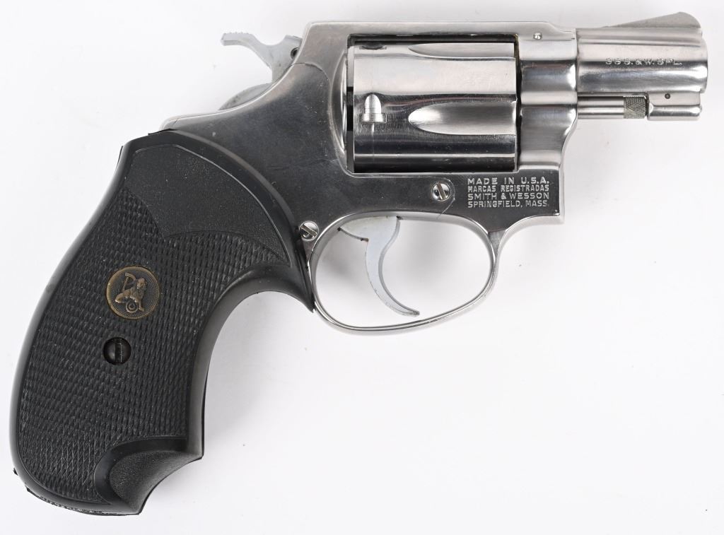 SERIAL NUMBER: R170349. BARREL: 1-1/8". CALIBER: .38 SPECIAL. MANUFACTURED: 1970'S. Standard markings and features. Five shot fluted cylinder. Ramped blade front sight and u-notch rear. Stainless finish. Round butt frame. After Market checkered rubber grip. Includes a non-matching Smith & Wesson box. CONDITION: Metal is excellent overall, with a few light scratches. Grip is excellent overall. Bore is shiny with crisp rifling. Tight hammer and cylinder. Sharp timing and lockup. Box has exterior wear. MODERN
