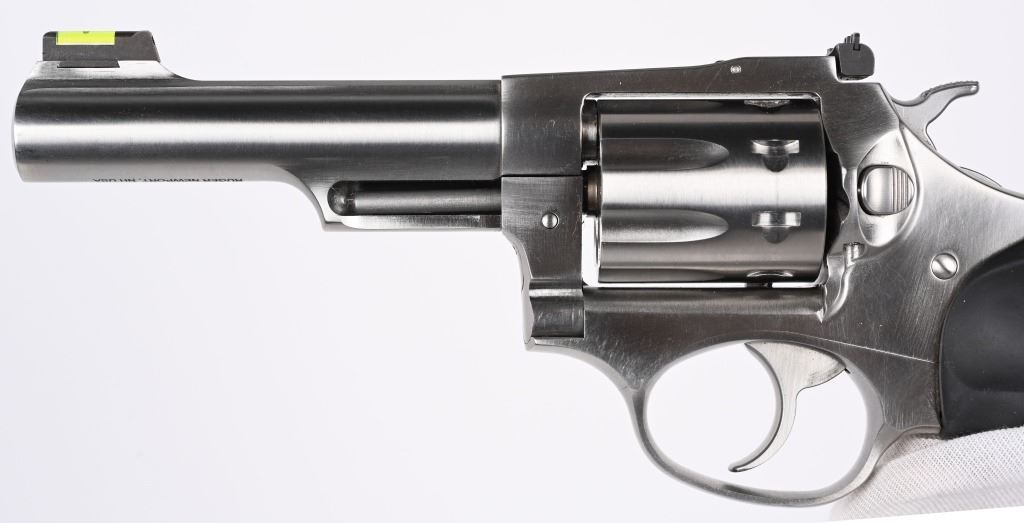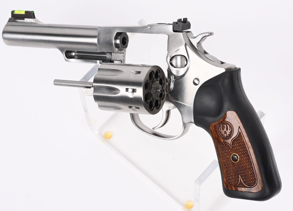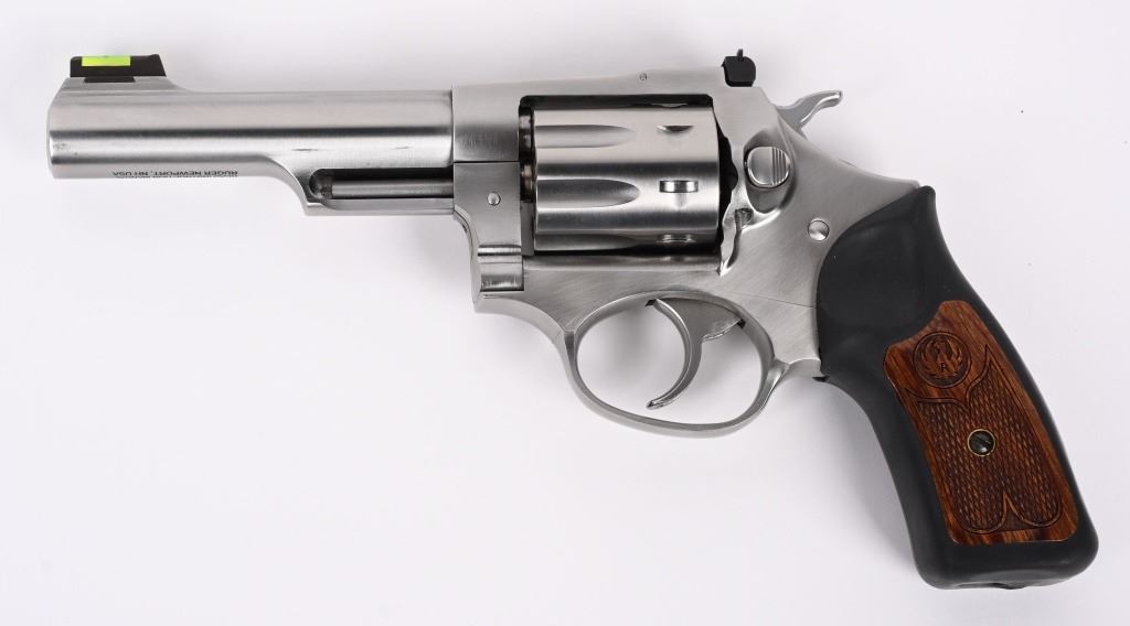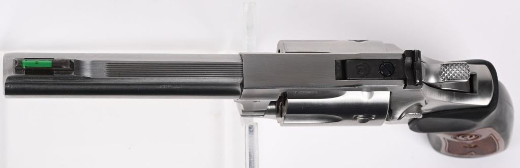 SERIAL NUMBER: 577-06117. BARREL: 4-1/4". CALIBER: .22LR. MANUFACTURED: 2012. Standard markings and features. Fiber optic blade front sight and adjustable u-notch rear. Polished stainless steel finish. Rubber grips, with checkered wood inlays. CONDITION: Metal is very good-excellent overall, with light scratches. Grips are excellent. Bore is shiny with crisp rifling. Sharp mechanics. MODERN