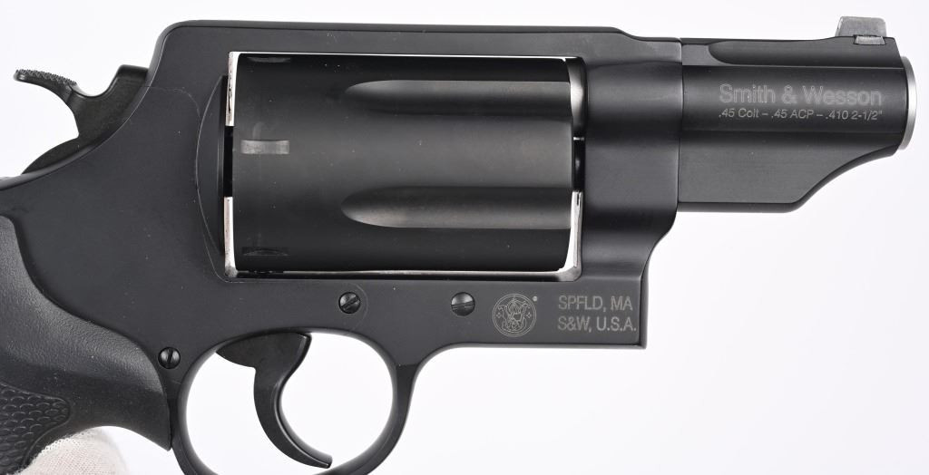 SERIAL NUMBER: DPJ3947. BARREL: 2-3/4". CALIBER: .45 COLT/.45 ACP/.410 GAUGE. MANUFACTURED: 2010's. Standard markings and features. Blade front sight and u-notch rear. Matte black finish and checkered rubber grips. Includes factory matching box, manual and lock. CONDITION: Metal and grips are excellent, with little signs of use. Bore is shiny with crisp rifling. Fired very little, if at all post factory. Mechancially fine. Box is excellent. MODERN