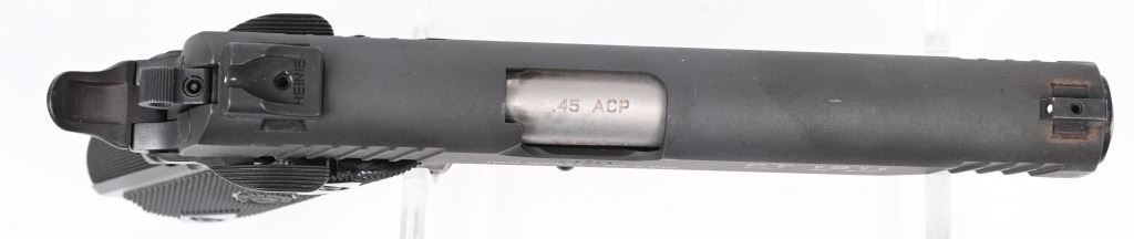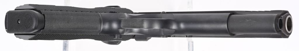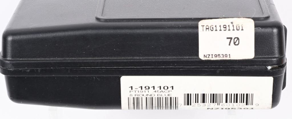 SERIAL NUMBER: NZI95391. BARREL: 5". CALIBER: .45 ACP. MANUFACTURED: 2000's. Made in Brazil. Blade front sight and u-notch rear. Matte blued finish and checkered black plastic grips. Includes two eight round factory blued steel magazine and matching hard plastic case. CONDITION: Metal is excellent overall, as are the grips. Bore is shiny with crisp rifling. Mechanically fine. Magazine is excellent, as is the case. MODERN