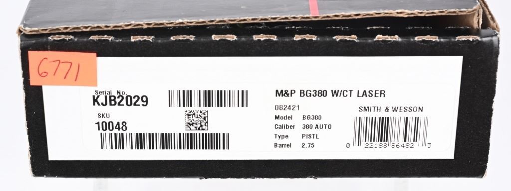 SERIAL NUMBER: KJB2029. BARREL: 2-3/4". CALIBER: .380 ACP. MANUFACTURED: 2020'S. Standard markings and features. Blade front sight and u-notch rear. Matte blued slide and black polymer frame. Factory Crimson Trace laser mounted on the frame. Includes two factory six round magazines, lock, soft case and serial matching box. CONDITION: Metal and frame are excellent overall, with little signs of handling. Bore is shiny with crisp rifling. Looks to be unfired from the factory. Box and accessories are excellent. MODERN