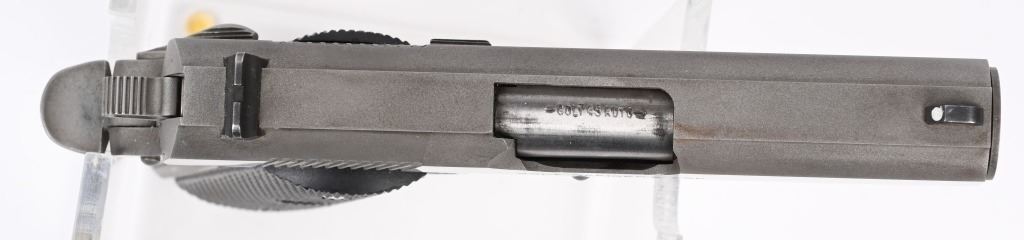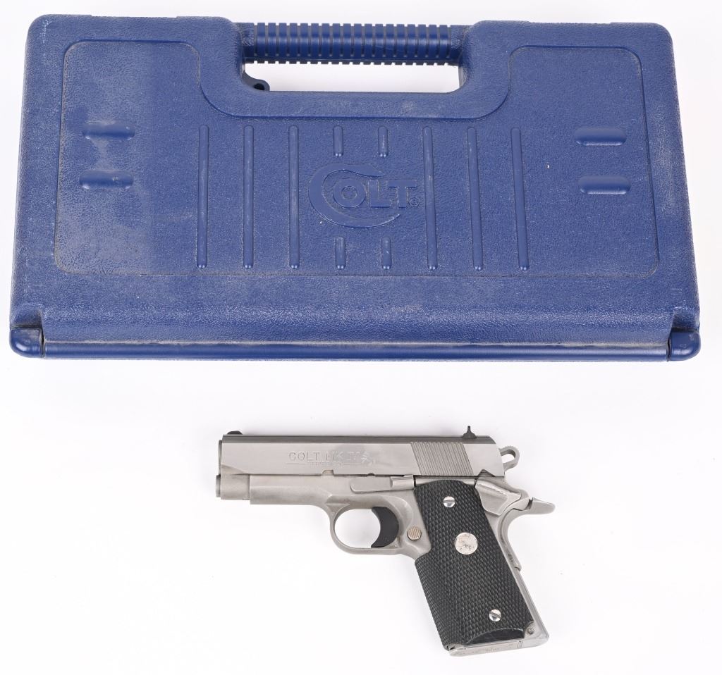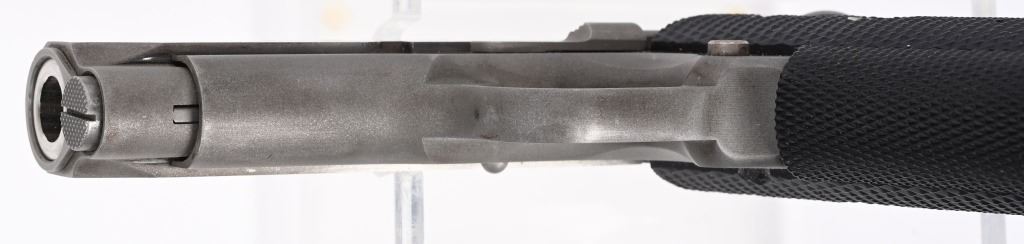 SERIAL NUMBER: SF17029E. BARREL: 3-3/4". CALIBER: .45 ACP. MANUFACTURED: 1997. Standard markings and features. 3-dot blade front sight and u-notch rear. Polished stainless steel finish and checkered wrap around rubber grips. Includes Factory magazine, manual and serial matching hard case. Metal and grips are excellent. Bore is shiny with crisp rifling. Mechanically fine. Magazine and case are excellent. MODERN