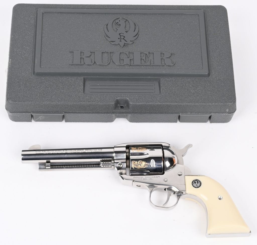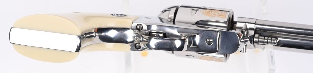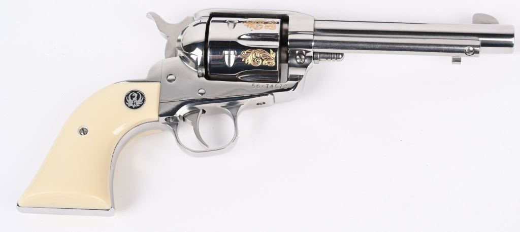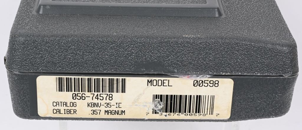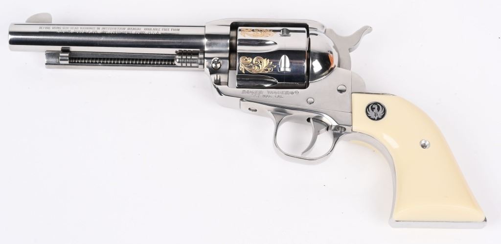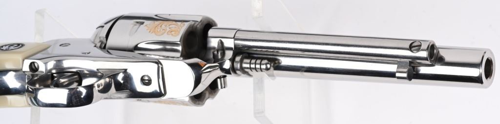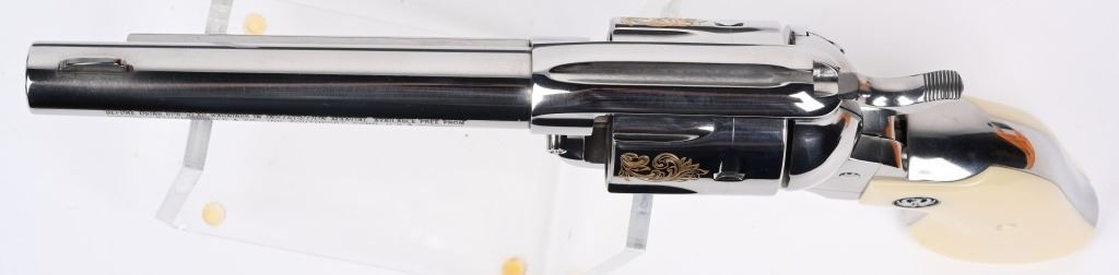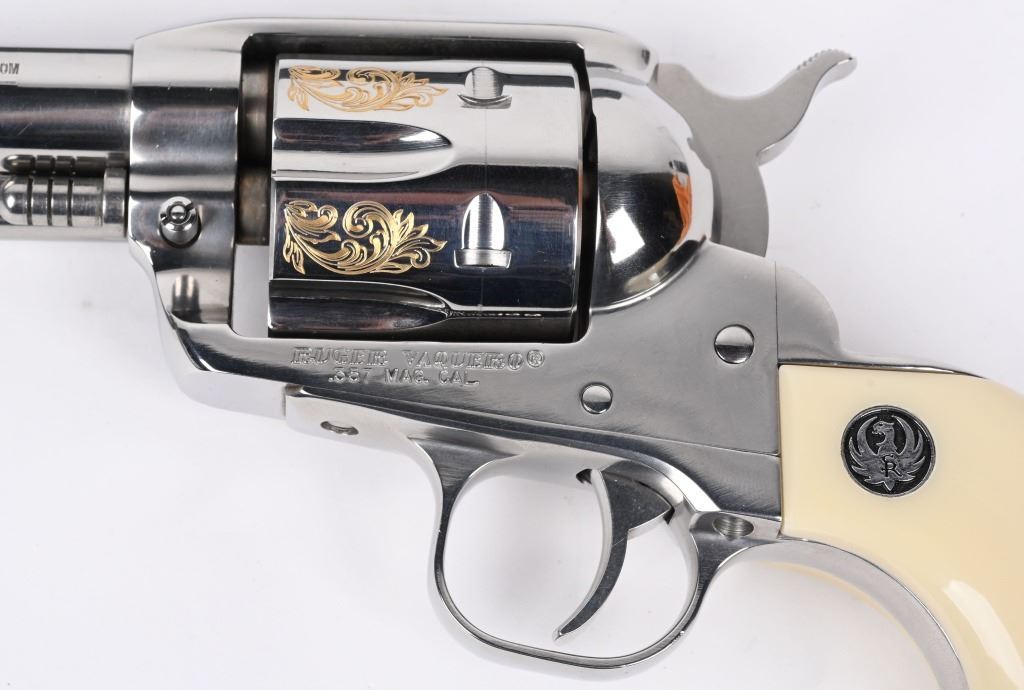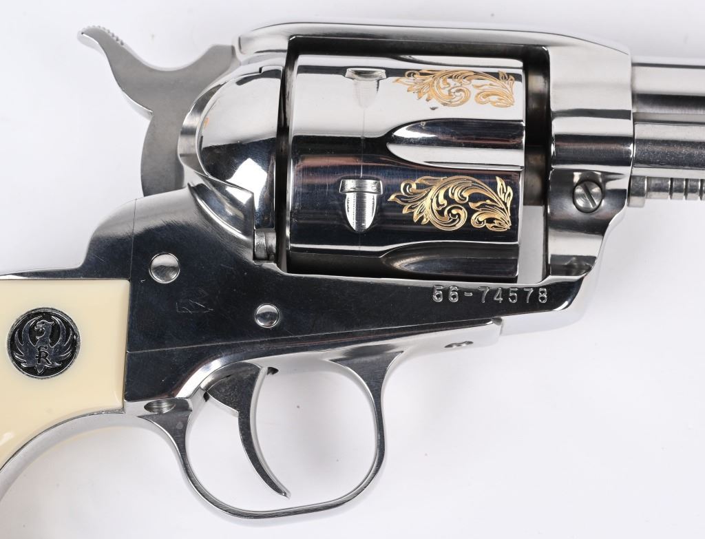 SERIAL NUMBER: 56-74578. BARREL: 5-1/2". CALIBER: .357 MAGNUM. MANUFACTURED: 1999. Special edition gun with fine laser scroll engraving on the cylinder. Standard sights. High polish stainless finish and imitation pearl grips. Includes serial matching hard case, lock and manual. CONDITION: Metal is excellent overall, as are the grips. Bore is clean overall with crisp rifling. Fine mechanics. Light drag line on the cylinder. Case is excellent. MODERN