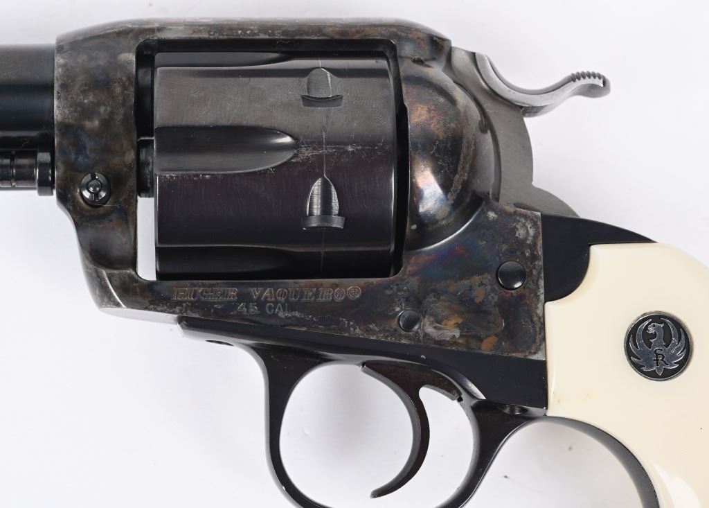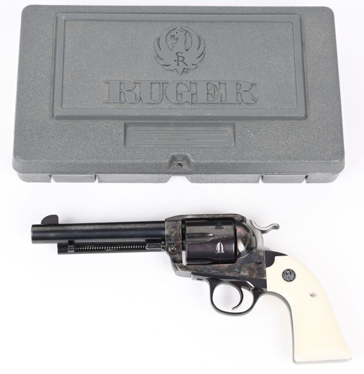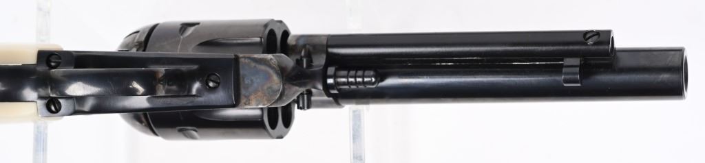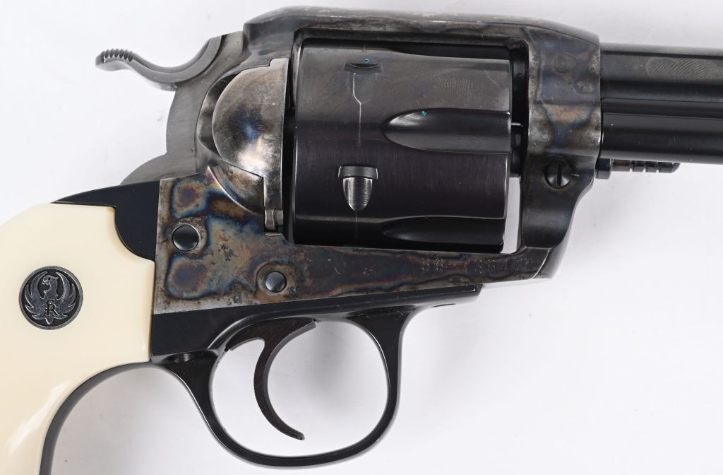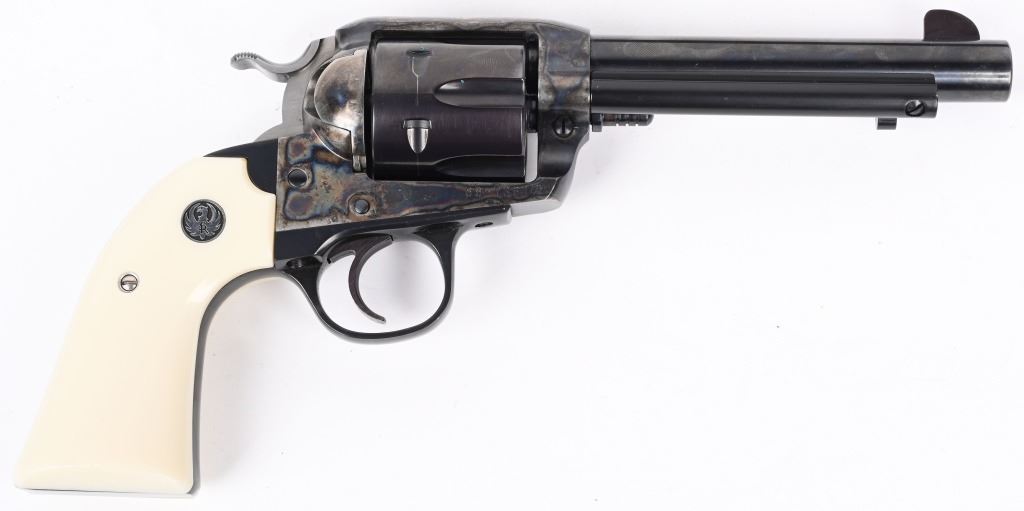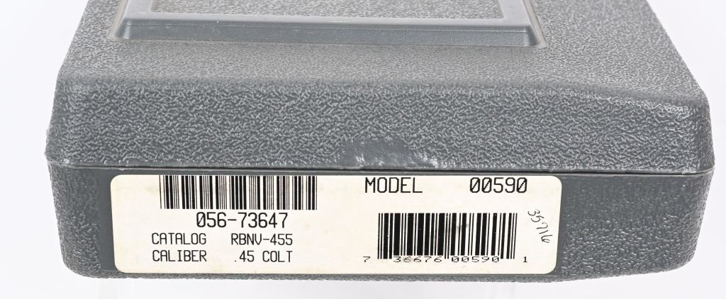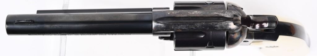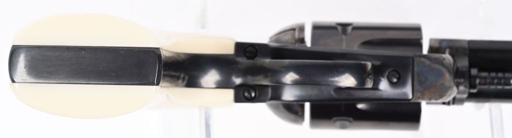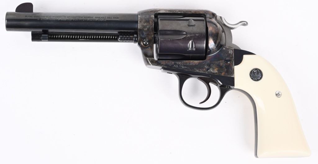 SERIAL NUMBER: 56-73647. BARREL: 5-1/2". CALIBER: .45 COLT. MANUFACTURED: 1997. Bisley grip model, with standard markings and features. Blade front sight and u-notch rear. Factory blued barrel and grip straps, with the frame being case colored. Imitation ivory, white plastic grips. Includes serial matching hard plastic case, lock and manual. CONDITION: Metal is excellent overall, with a few minor handling marks. Grips are excellent. Bore is shiny with crisp rifling. Sharp mechanics. Cylinder has a light drag line. Case is excellent. MODERN