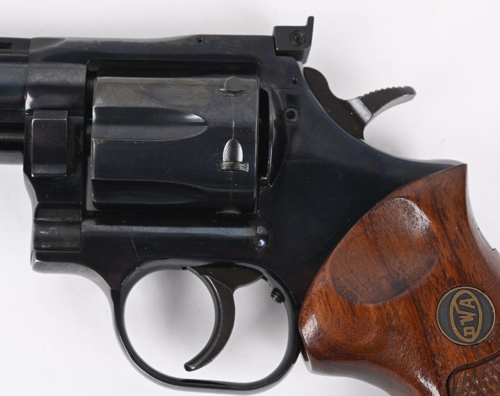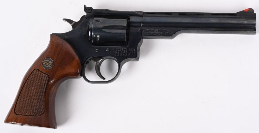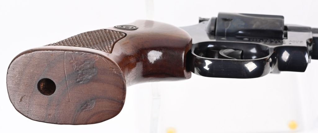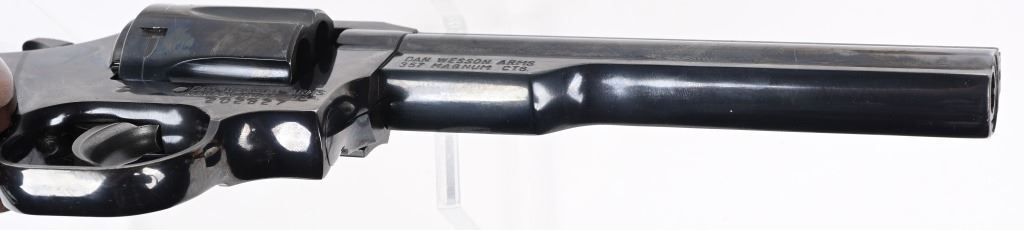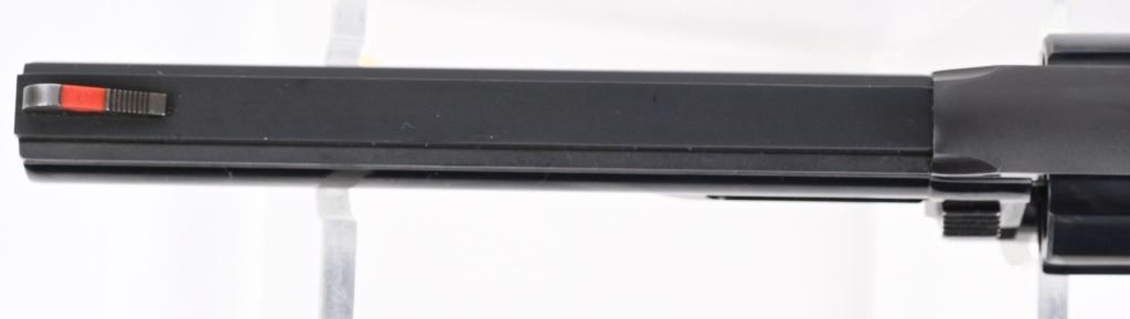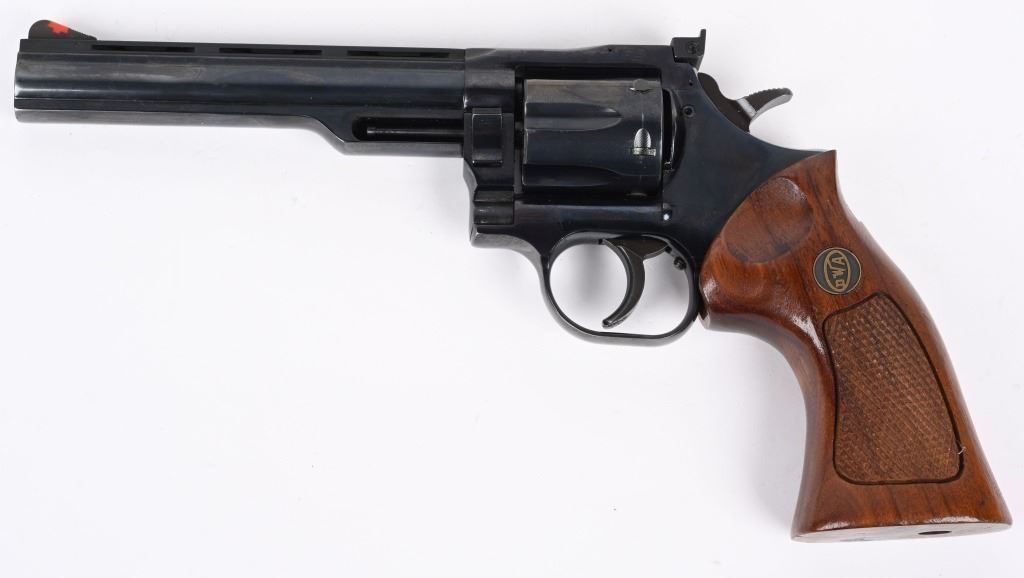SERIAL NUMBER: 202827. BARREL: 6". CALIBER: .357 MAGNUM. MANUFACTURED: 1980's. Vent rib barrel with blade front sight and adjustable u-notch rear. Original blued finish on the metal components and checkered wood target style grips. Includes manual and original Styrofoam box. CONDITION: Metal is excellent overall, with a few minor scratches and scrapes. Grips are excellent. Bore is shiny with crisp rifling. Sharp mechanics. Box is excellent. MODERN