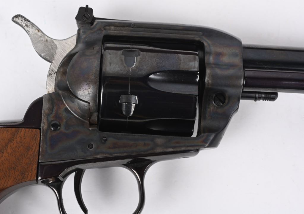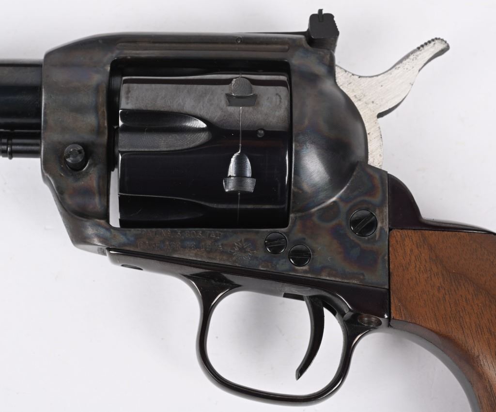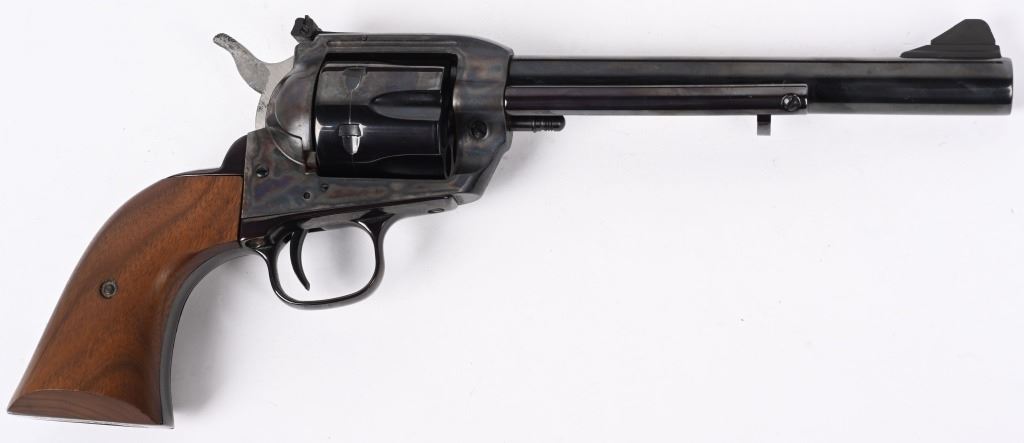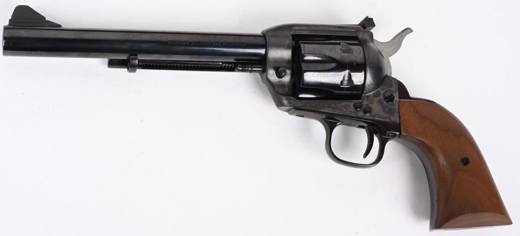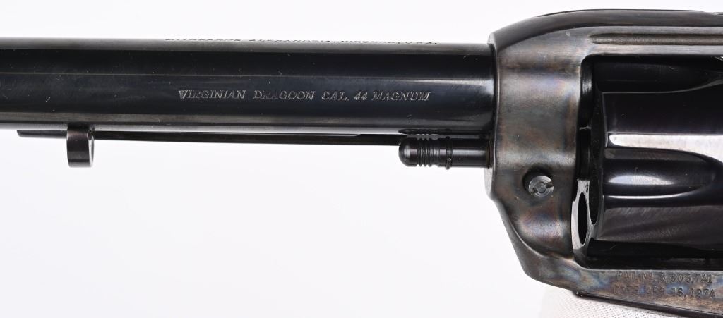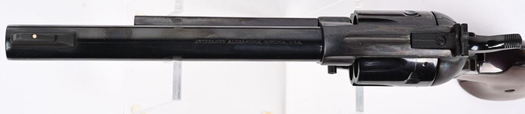 SERIAL NUMBER: 33294. BARREL: 7-1/2". CALIBER: .44 MAGNUM. MANUFACTURED: 1980s. Made by Interarms in Midland Va, being based on the classic Colt Single Action Army. Blade front sight and adjustable u-notch rear. Original blued finish and case colored frame. Oiled wood grips. Includes original box (not matching). CONDITION: Metal is excellent overall, with a few handling marks. Grips are excellent as well. Bore is shiny with crisp rifling. Sharp mechanics. Light drag line on the cylinder. Box is excellent. MODERN