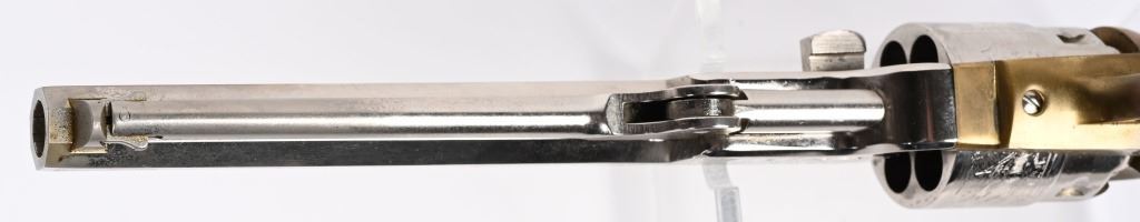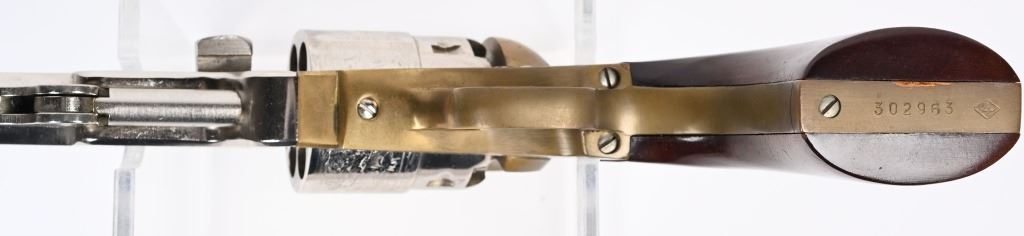 SERIAL NUMBER: 302963. BARREL: 7-1/2". CALIBER: .44 BLACKPOWDER. MANUFACTURED: 1991. Standard Italian proofs. Cylinder is engraved with the normal naval engagement scene. Fine scroll engraving on the barrel and frame. Brass pin front sight. Barrel assembly is nickel plated, with the frame being brass. Smooth finish oiled wood grips. CONDITION: Metal is good overall, with the muzzle area being slightly tarnished. Grips have a few minor handling marks. Clean bore with crisp rifling. Tight hammer and cylinder. ANTIQUE/BLACKPOWDER