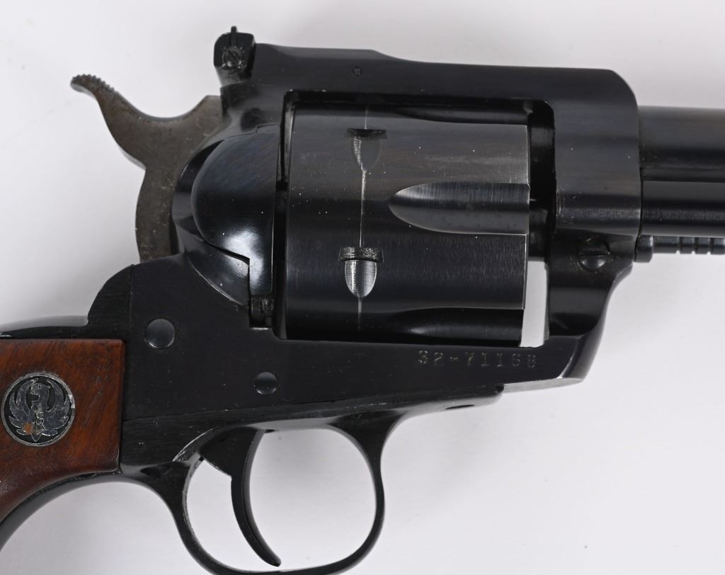 SERIAL NUMBER: 32-71168. BARREL: 6-1/2". CALIBER: .357 MAGNUM. MANUFACTURED: 1975. Standard configuration, with blade front sight and adjustable u-notch rear. Original blued finish and oiled wood grips, with phoenix medallions. CONDITION: Metal is excellent overall, with a few minor scratches. Grips have light handling marks. Bore is shiny with crisp rifling. Crisp mechanics. MODERN