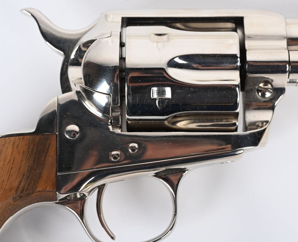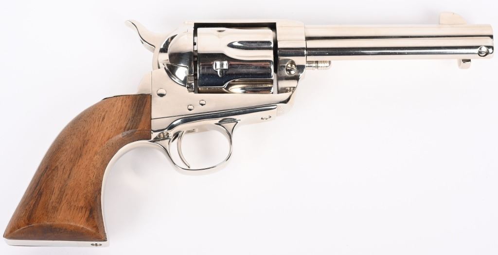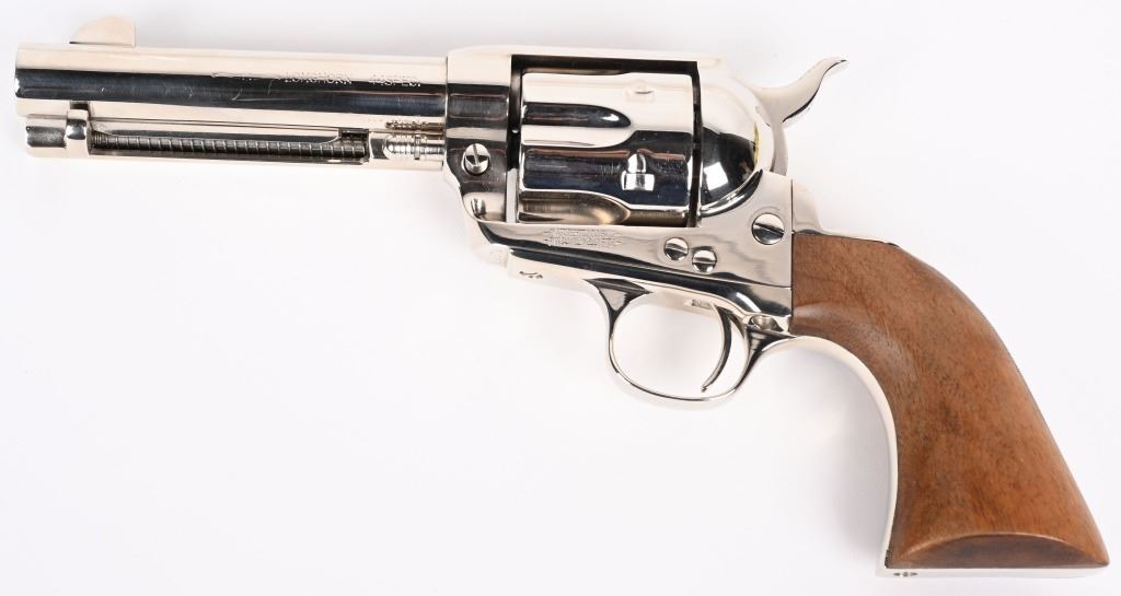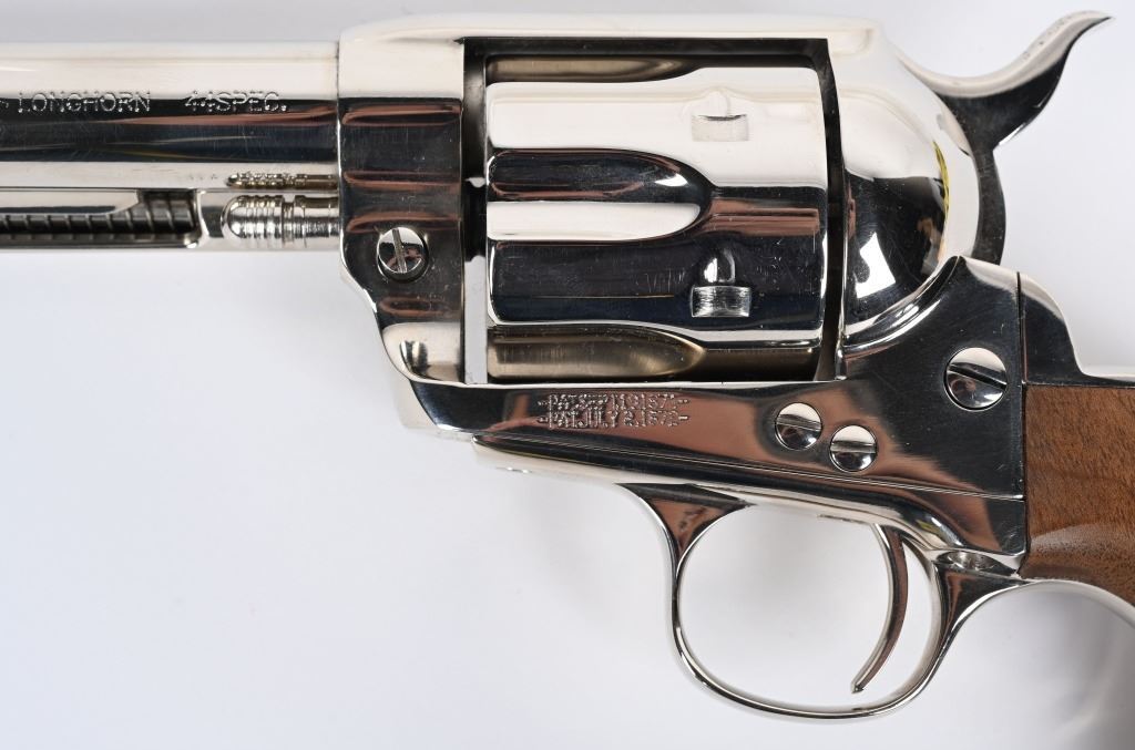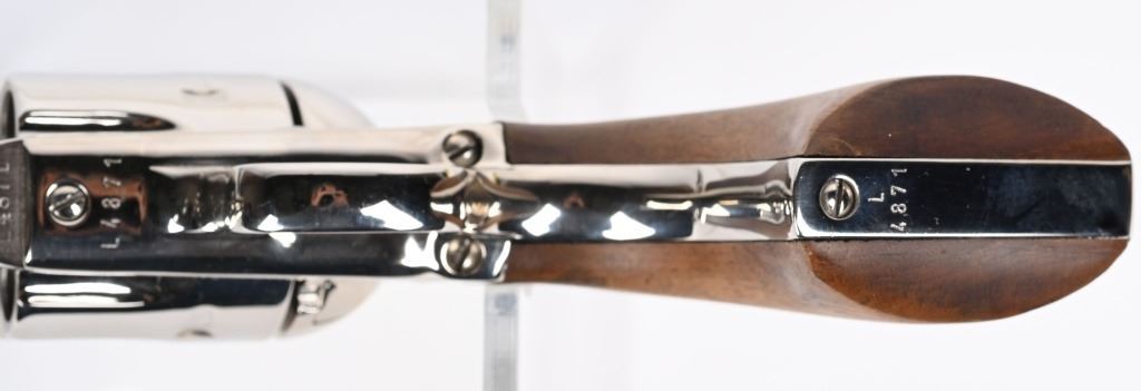 SERIAL NUMBER: L4871. BARREL: 4-3/4". CALIBER: .44 SPECIAL. MANUFACTURED: 1990'S. Standard blade front sight and v-notch rear. Bright nickel finish and oil finished wood grips. CONDITION: Metal is very good overall, with a few handling marks and scratches. Grips are excellent. Bore is clean overall, with strong rifling. Sharp cylinder and mechanics. MODERN