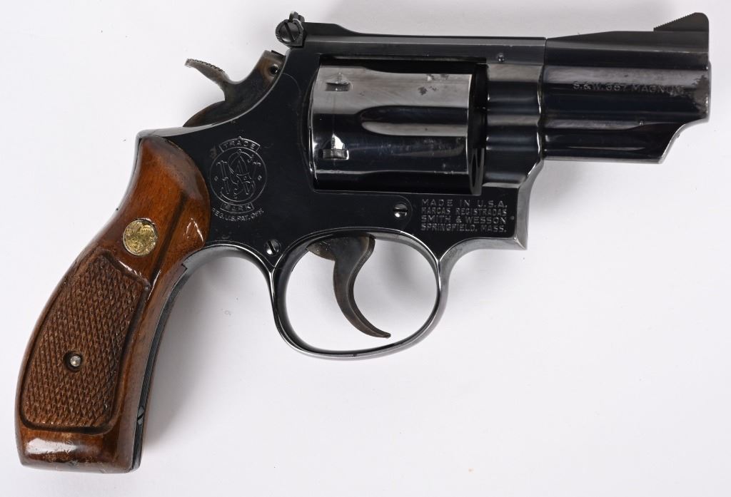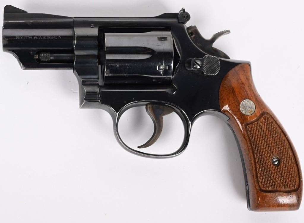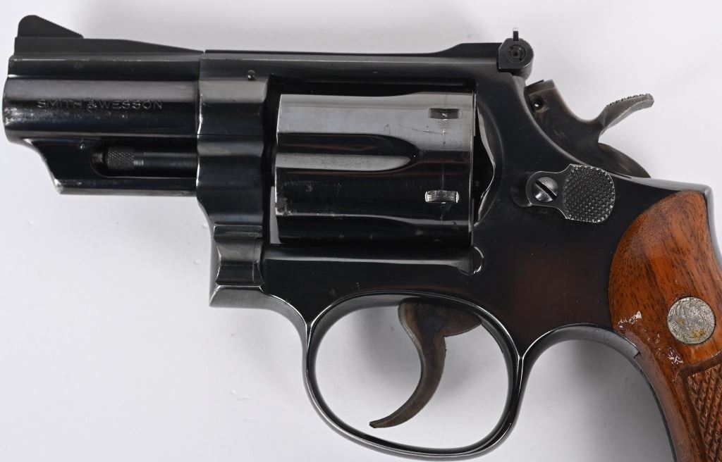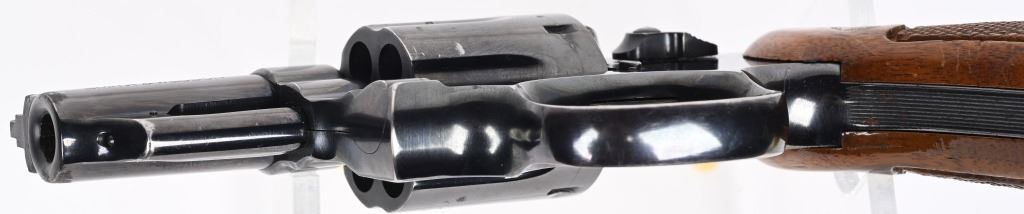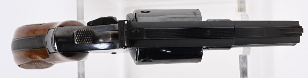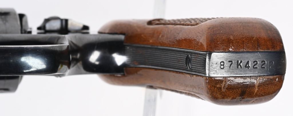 SERIAL NUMBER: 87K4222. BARREL: 2-1/2". CALIBER: .357 MAGNUM. MANUFACTURED: 1970'S. Pinned barrel with ramped blade front sight and adjustable u-notch rear. Factory blued finish and checkered wood magna grips, with silver monogram medallions. Case colored trigger and spurred hammer. Round butt frame. Six shot fluted cylinder. CONDITION: Metal is very good overall, with general wear and scratches. There is some cleaned pitting on the right side of the muzzle. Grips have a few handling marks. Strong bore, with very good rifling. Sharp mechanics. MODERN