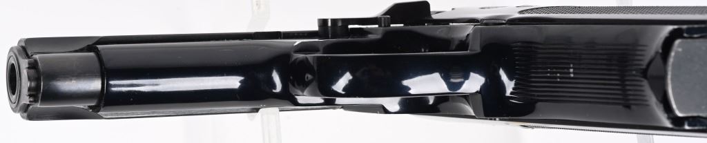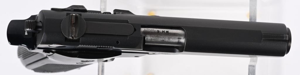 SERIAL NUMBER: A462185. BARREL: 4". CALIBER: 9MM LUGER. MANUFACTURED: 1970's. Standard markings and features. Blade front sight and adjustable rear. Original blued slide and black alloy frame. Checkered black plastic grips. Includes factory blued steel 14 round magazine. CONDITION: Metal is very good overall, with light wear and handling marks. Grips have light scratches and wear. Bore is shiny with crisp rifling. Magazine is excellent. Fine mechanics, with de-cocker working as it should. MODERN