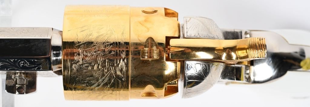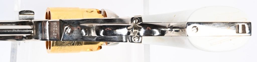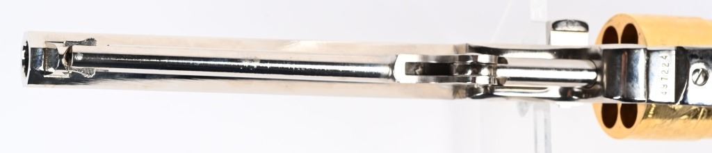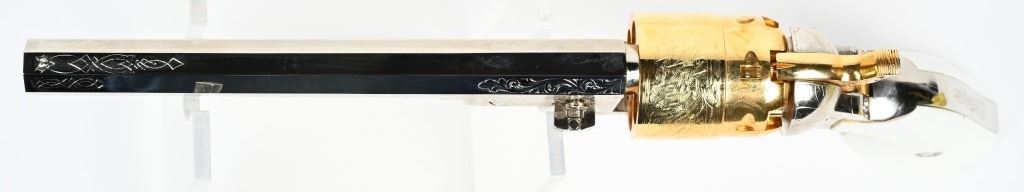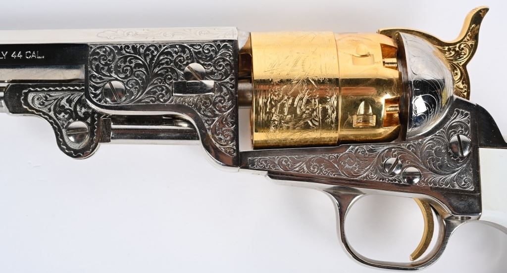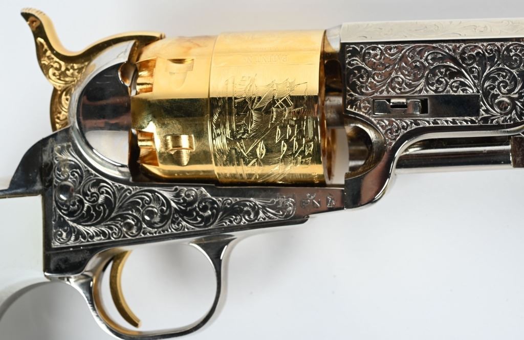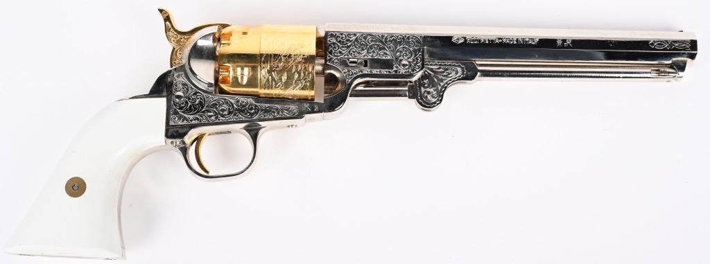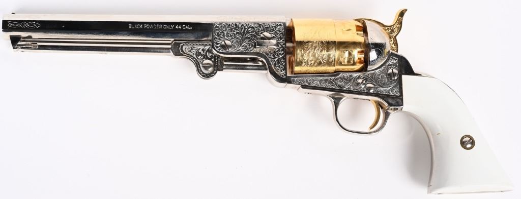 SERIAL NUMBER: 497224. BARREL: 7-1/2". CALIBER: .44 CAL BLACKPOWDER. MANUFACTURED: 2003. Octagon barrel with pin front sight. Naval engagement scene engraved on the frame. Fine floral engraving on the frame and barrel assembly. Nickel plated barrel assembly and frame, with the hammer and cylinder being gold plated. White imitation ivory grips. CONDITION: Metal and grips are excellent overall, with a few minor handling marks. Bore is clean overall with crisp rifling. Sharp mechanics. Looks to be unfired from the factory. ANTIQUE/BLACKPOWDER