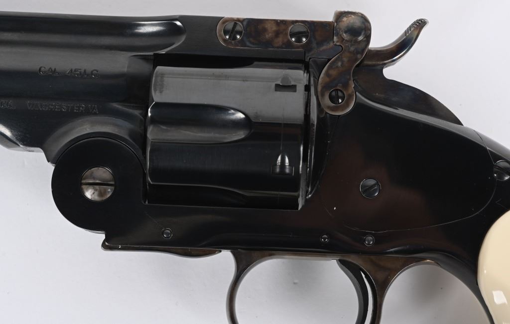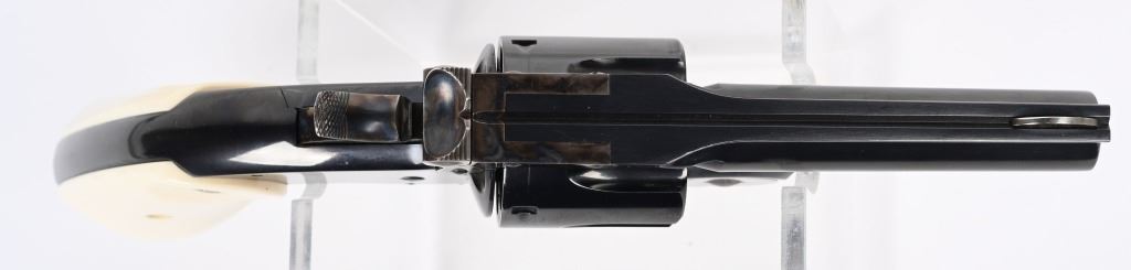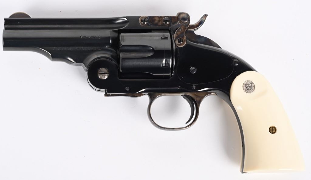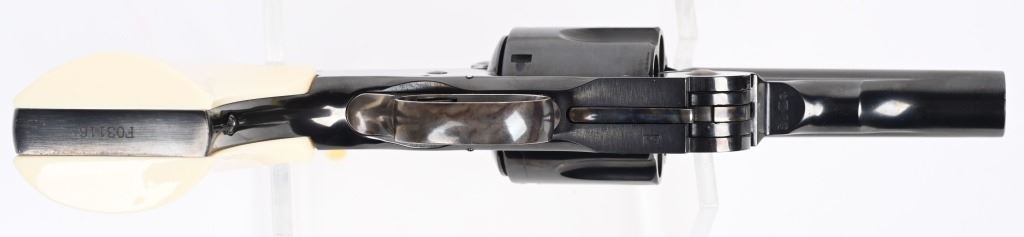 SERIAL NUMBER: F03116. BARREL: 3-1/2". CALIBER: .45 LONG COLT. MANUFACTURED: 2007. Import marked on the barrel. "U.S." marked on the butt. Standard sights. Factory blued finishes and case colored hammer/barrel latch. Imitation ivory white plastic grips. CONDITION: Metal and grips are excellent overall. Grips are excellent. Bore is shiny with crisp rifling. MODERN
