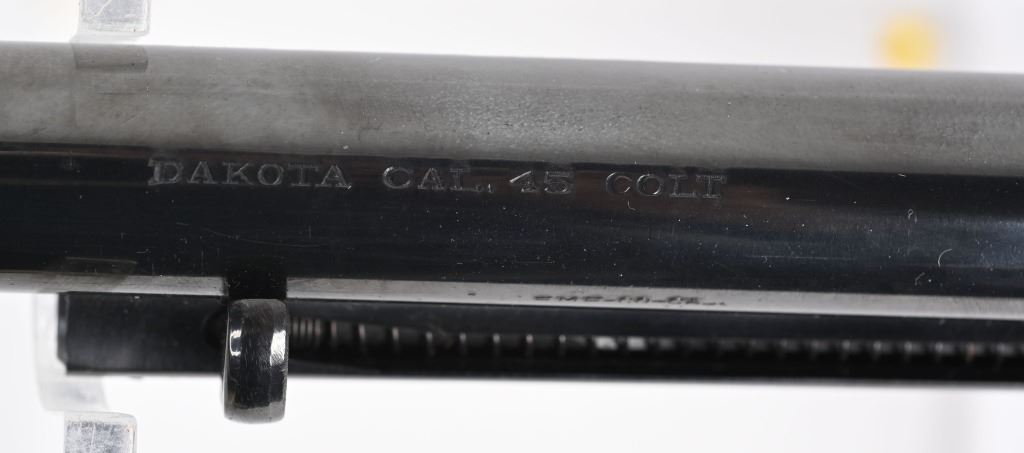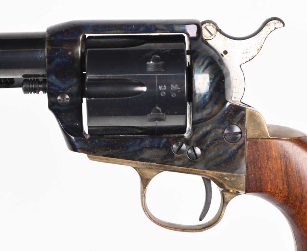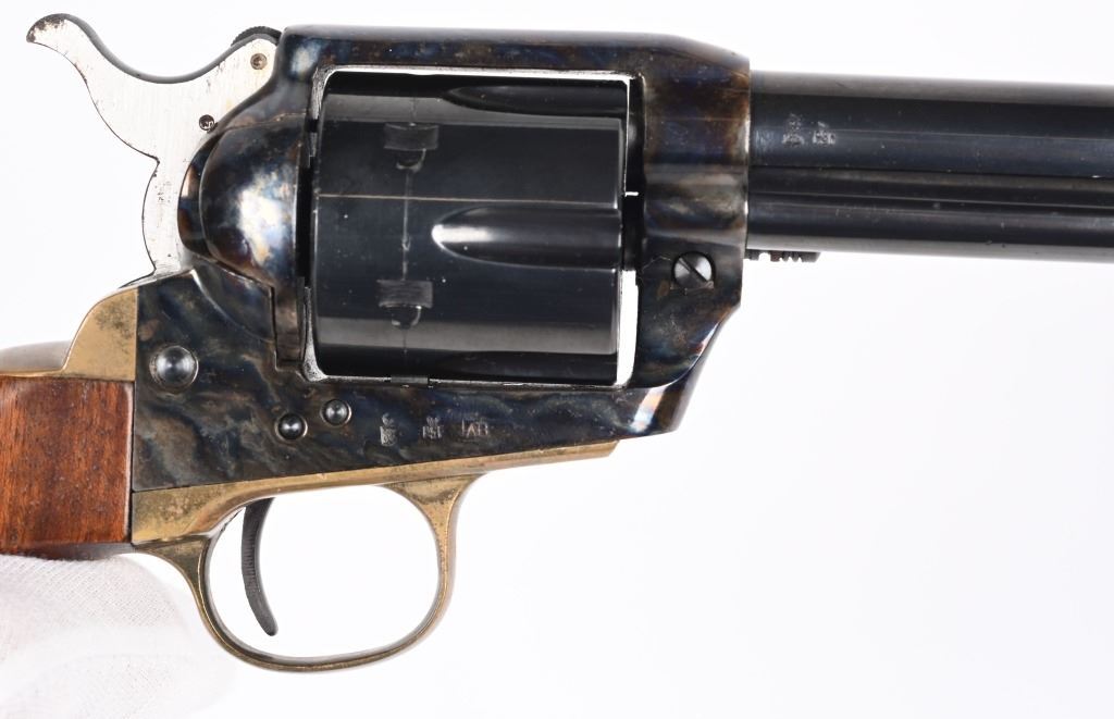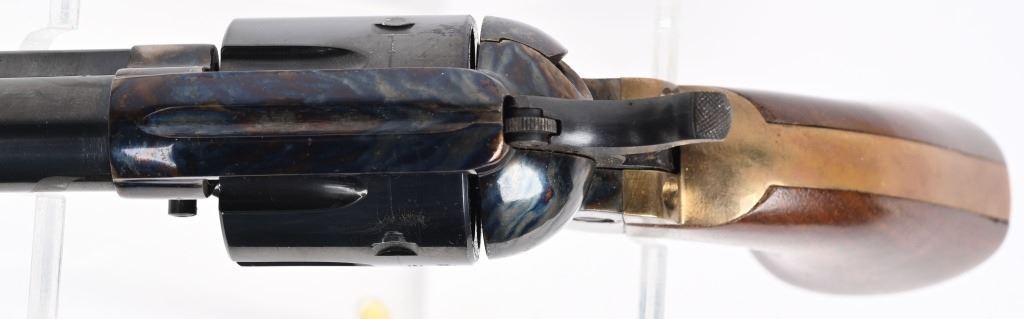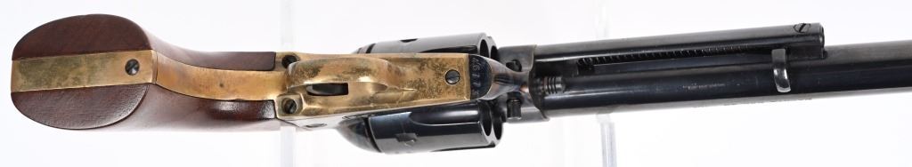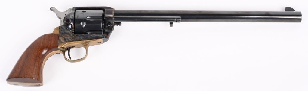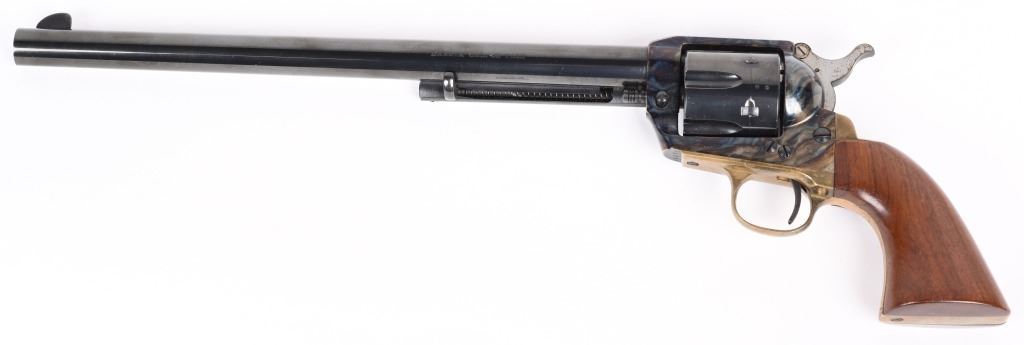 SERIAL NUMBER: 46773. BARREL: 11-3/4" barrel. CALIBER: .45 COLT. MANUFACTURED: 1976. Made in Italy, with standard Italian proofs. Blade front sight and u-notch rear. Blued barrel and six shot fluted cylinder. Case colored frame. Brass grip straps and oiled finished wood grips. CONDITION: Metal is excellent overall, with a few handling marks. Grips are excellent. Bore is shiny with crisp rifling. Sharp mechanics. MODERN